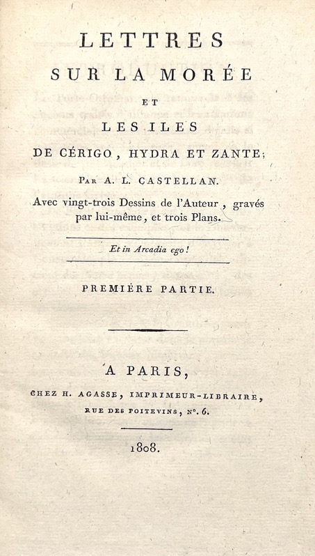 Édition originale complète de ses planches malgré la mention de la page de titre. Parti pour Constantinople à la demande du gouvernement français en 1796, Castellan (1772-1838) dut s’arrêter en Morée et dans les îles voisines où il recueillit un nombre important d’informations dont il donne témoignage dans ces lettres. Bel exemplaire. Blackmer, 298 ; Chahine, 821.