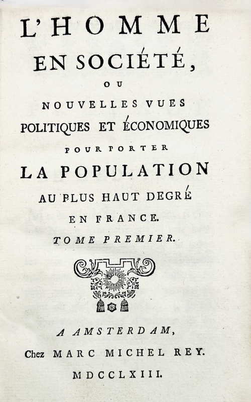 Édition originale du plus important livre de l’auteur et aussi le plus rare. « Plan de réformes entraînant la suppression des métiers parasites, l’élévation des salaires des journaliers, l’amélioration du sort des paysans, des maisons de retraite pour les malades, les vieillards, les infirmes, de façon à assurer au genre humain, avec la suppression des abus de l’administration, le bonheur commun et projet de règlement au sujet des femmes publiques » (INED). Bon exemplaire. Petite galerie marginale de ver sur 23 feuillets. Étiquette des frères Labottière, imprimeur-libraires bordelais au XVIIIe siècle. Kress, 6105 ; Higgs, 3036 ; INED, 2117 ; Goldsmiths, 9831.