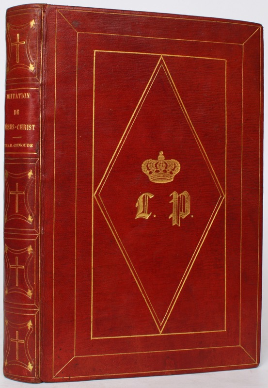 Grand in-8 de (2)-416 pp., maroquin rouge, dos lisse orné, cadre losange rectangle sur les plats, chiffre et couronne royale frappés au centre, dentelles sur les chasses et guillochis dorés sur les coupes, garde de moire bleu, tranches dorées (reliure de l’époque).