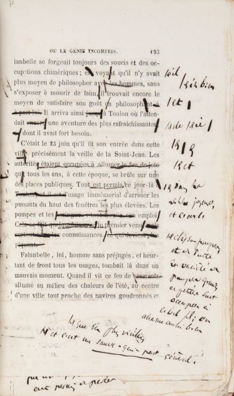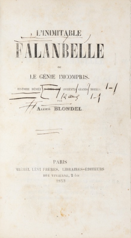 Exemplaire d’épreuves abondamment corrigées de l’unique roman d’Alexis Blondel, publié en 1853 chez Michel Lévy frères. Les corrections à l’encre ou au crayon couvrent chaque page de biffures, renvois dans la marge, rectifications mais aussi développements et reprises de quelques passages. Au printemps de l’année 1834, vivait à Paris un ouvrier, non de ceux faits pour l’établi, mais de ceux-là qui ont la figure pâle et allongée, lisant chaque matin le journal, et assistant aux cours de la Sorbonne et du Collège de France, pèsent en leur main le fort et le faible des empires, et jugent de la moralité des peuples et des potentats. Il s’appelait Sosthène Falanbelle (incipit). En 1853, le Second Empire entre dans sa deuxième année, Alexandre Dumas publie Joseph Balsamo et George Sand Les Maîtres sonneurs mais l’inconnu Alexis Blondel inscrit son premier (et unique) roman dans cette nouvelle littérature ouvrière représentée par Agricol Perdiguier dont les Mémoires d’un compagnon avaient paru en 1852. Salué par le seul Jules Janin (« Alexis Blondel a vécu, j’en suis sûr, dans la foule des ouvriers de Paris, il en sait toutes les espérances, toutes les vanités et s’il ne les a pas partagées, il en a connu du moins tous les égarements »), L’Inimitable Falanbelle fut vite oublié mais annonçait plus d’un demi-siècle en amont Martin Eden de Jack London.