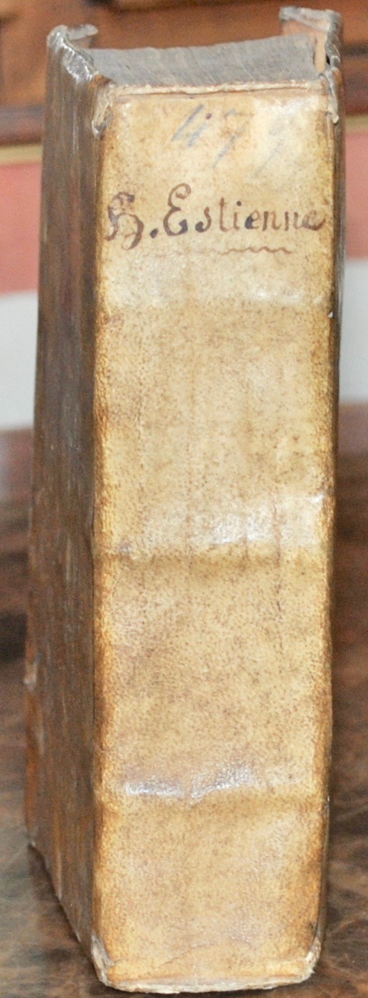 Rare édition montbéliardaise établie par Jacques Foillet du chef-d’oeuvre satirique d’Henri Estienne publié une première fois en 1566. « Cette édition serait la quatorzième (mention manuscrite de 12° sur le titre à l’encre du temps ndlr) et ne contient pas plus que les précédentes les passages supprimés par ordre du Conseil de Genève à l’apparition de l’édition originale en 1566, passages où se trouvaient des propos vilains et parlant trop évidemment des princes en mal ». La tradition veut que ce livre qui dénonçait les contresens et les déformations que les traducteurs avaient introduits dans les Histoires d’Hérodote et partant les travers contemporains, ait valu à son auteur d’être brûlé en effigie à Paris, sur la place de Grève. Marque au cerf sur le titre gravée ici pour la deuxième fois depuis 1603, de l’imprimeur Jacques Foillet qui introduisit – après la tentative avortée de François Estienne – la typographie à Montbéliard en 1586 ; l’Apologie pour Hérodote offre cette particularité de porter sur le titre comme lieu d’impression les seuls mots Sur les Hasles lieu d’impression attribué à Foillet, où il ouvrit également une librairie. « Cette ville (Montbéliard) fut lors des guerres de la Réforme, un des plus vastes ateliers de la typographie protestante ; ce fut à la suite du célèbre colloque qui eut lieu entre Théodore de Bèze, le prince de Wurtemberg, Jacques André en mai 1586, à Montbéliard que l’imprimerie fut introduite dans cette ville. Les Actes de ce colloque furent publiés en 1588 ; ils étaient imprimés par un typographe qui depuis acquit une juste célébrité : c’était Jacques Foillet (ou Foyllet), natif de Tarare ville du Lyonnais, et frère d’un imprimeur de Paris, nommé Robert ; de 1587 à 1618, on pourrait citer une immense quantité de livres de polémique religieuse, de sciences et de belles-lettres sortis de cette importante officine dont plusieurs traductions latines de traités de Machiavel » (Deschamps). Ex-libris manuscrit ancien sur le titre « Fronquier ». Rousseurs parfois fortes, petite galerie de ver dans le texte entre les pages 170 et 220, traces de salissure sur la reliure. Brunet II, 1076 pour l’originale ; Deschamps, Dictionnaire de géographie, 874 ; Albert Roux, Catalogue des Impressions montbéliardaises de 1587 à 1793, n°97.