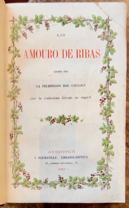 Édition originale bilingue en langue d’oc avec la traduction française en regard du premier recueil de poésie en Provençal moderne écrit par une femme, La Felibresso dou Cauloun, pseudonyme de Marie-Louise Martin connue sous le nom de Marie d’Arbaud (1844-1927). Elle est la mère de Joseph d’Arbaud le « Prince de Camargue » (1874-1950) considéré avec Frédéric Mistral comme le meilleur écrivain d’expression provençale. Ce recueil tient à ce titre une place particulière dans l’histoire du félibrige, le mouvement de renaissance littéraire provençale. Bel exemplaire de ce livre rare relié en maroquin signé Chabert fils avec sa couverture conservée. Pales rousseurs.