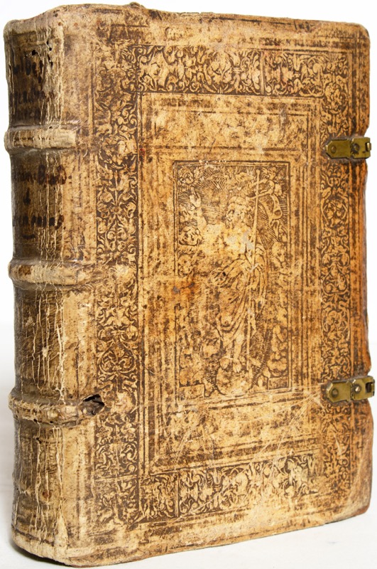 Liturgie latine (caractères romains) et allemande (caractères gothiques) imprimée en rouge et noir à l’usage de l’Église catholique de l’archidiocèse de Salzbourg dont l’archevêque Michael von Kuenburg (1514-1560) fut le premier à faire de la lutte contre le protestantisme sa priorité en tant que souverain. Colophon: Salisbvrgi excudebat ioan. Baumañ, Anno salutis, M. D. LVII. Deux tirages furent exécutés la même année, sortis des presses du premier imprimeur de la ville Johann Baumann (Dodgson, II, p. 262) tandis que Deschamps signale l’introduction de la typographie à Salzbourg en 1594 (article Juvanum in Dictionnaire de Géographie, 681). Elle est ornée d’une large vignette de titre aux armes de l’archevêque de Salzbourg et 17 bois gravés dans le texte (certains répétés) dont 2 à pleine page. Provenance : mention manuscrite sur le contreplat supérieur d’un prix fondé par le comte Joannis Philippi de Hoyos en 1726 ; suite d’initiales manuscrites sur le contreplat inférieur datées 1575. Rare spécimen de reliure germanique à l’effigie de saint Jean-Baptiste dont le décor est inconnu à la Bibliothèque Sainte Geneviève (Reliures estampées à froid de la Bibliothèque Sainte-Geneviève, 12e -18e siècles). Assez bel exemplaire malgré quelques frottements sur les plats, piqûres de vers au dos ; tache marginale au dernier feuillet. Gilhofer & Ranschburg (1927), The XVIth Century : A Large Collection of Valuable Books on all subjects printed from 1501 up to 1600, I n°1030, p. 68 : « Dodgson, II, p. 262. Rare edition of this agendum printed by the first printer of Salzburg Joh. Baumann. Two of the nice woodcuts are the work of the Master CW and signed by him. The other woodcuts are by different artists. The text is partly in German ».