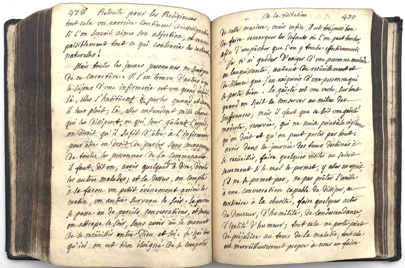 Manuscrit daté 1754 consacré à la retraite pour les religieuses de la Visitation Sainte-Marie de Bellecour à Lyon, établi selon l’avertissement d’après la parole du Révérend Père de Chargey : octave de méditations, conférences et lectures qui abordent plusieurs aspects de la vie religieuse comme les amitiés et les aversions naturelles, le voeu de chasteté, les péchés des religieux, la pensée de la mort, la médisance, les tentations secrètes, la vie domestique de Jésus Christ avec les apôtres etc. Suivi, avec une pagination séparée de : Récapitulation de la retraite donnée à l’Abbaye Royales des Dames de Saint Pierre de cette ville au mois de septembre 1754 par les Révérends Pères de Chargey et de Vaubonne qui contient Pratique de piété pour se préparer à la fête de Saint François de Sales, les trois jours qui la précèdent et pour l’octave qui la suit. L’ordre de la Visitation Sainte-Marie est présent à Lyon à partir de 1615. Le premier monastère est ouvert à Bellecour : la Visitation Sainte-Marie de Bellecour. En 1613, les travaux du premier monastère de l’ordre débutent à Annecy et se termineront en 1614. Face au succès rencontré, l’ordre décide très vite de fonder d’autres couvents. Lyon est choisi pour la création d’un deuxième établissement en 1615. Ce sera le premier en France. Mais pour obtenir les autorisations, François de Sales va se confronter au cardinal archevêque de Lyon Denis-Simon de Marquemont qui refusera de transiger sur ce qui constituait jusqu’alors les fondements mêmes de l’ordre : une clôture stricte devra être respectée par les sœurs et ce afin de se conformer aux règles en vigueur imposées par Rome aux congrégations de religieuses. A partir de cette date, cette règle s’appliquera à tous les nouveaux monastères de l’ordre qui s’ouvriront et se traduira physiquement dans les plans des monastères qui seront conçus de façon à respecter la réclusion des soeurs. (Patrimoine Lyon) Provenance manuscrite (titre) : « Ce livre du Monastère de la Visitation de Ste Marie de Montélimar ». Un seul manuscrit attribué au Père de Chargey est recensé au Catalogue collectif de France et conservé à la Bibliothèque de l’Académie des Sciences, Belles-Lettres et Arts de Lyon (cote Ms PA 86) : « Retraite spirituelle, donnée dans le premier monastère de la Visitation Sainte-Marie de Bellecour, à Lion, en 1754, par le R. P. de Chargey, de la C. de J. » (279 pages). Copieux manuscrit rédigé à l’encre brune, parfaitement lisible, conservé dans sa première reliure en maroquin noir janséniste.