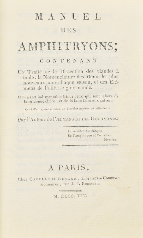 Manuel des Amphitryons ; contenant un Traité de la Dissection des viandes à table, la Nomenclature des Menus les plus nouveaux pour chaque saison, et des Élemens de Politesse gourmande. Ouvrage indispensable à tous ceux qui sont jaloux de faire bonne chère, et de la faire aux autres. Par l'Auteur de l'Almanach des Gourmands.