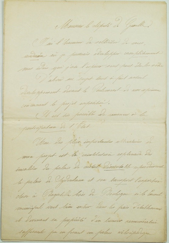 Projet manuscrit pour l’aménagement de l’entrée de l’exposition universelle, proposé par M. C. Langlois : « Faire du Palais de l’Industrie l’Entrée principale et monumentale ». Ce projet est accompagnée d’une lettre adressé à M. le député de Grenelle : « J’ai l’honneur de solliciter de vous, audience où je pourrais développer complètement mes idées qui j’ose l’espérer sont peut être les vôtres ».