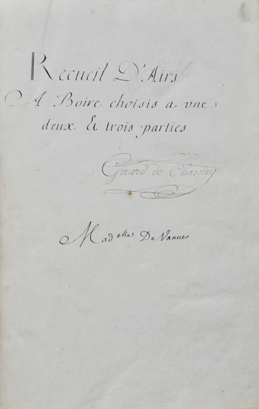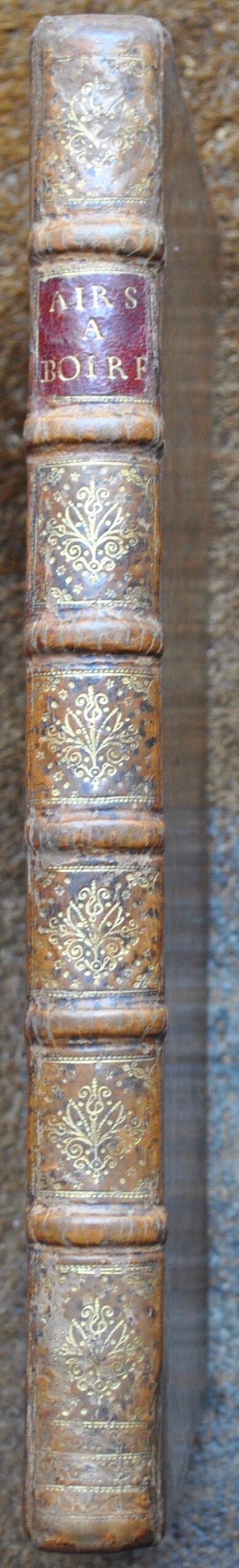 In-folio de (4) ff. de table, 112 ff. mal paginés, veau granité, dos orné à nerfs, pièce de titre en maroquin rouge « Airs à boire », tranches marbrées (reliure de l’époque).