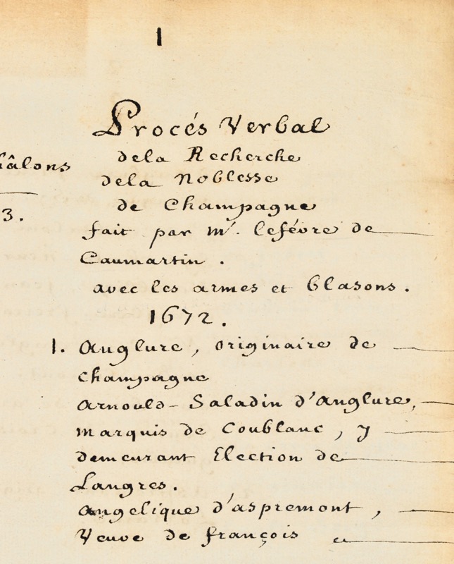 Procès-verbal manuscrit conforme à l’imprimé éponyme publié en 1673, extrait des Recherches de la noblesse de Champagne de Louis-François Le Fèvre de Caumartin publié la même année à Chaâlons, chez Jacques Seneuze en deux grands volumes in-folio ; « On a tiré si peu d’exemplaires des généalogies des maisons et familles de cette province, que l’on a crû que celles qui ne voudraient pas faire la dépense d’en acheter le recueil entier, seraient bien aises d’avoir au moins le présent procès-verbal afin de voir en abrégé tout ce qu’il contient, pour la satisfaction de tous les curieux » (Saffroy). Louis-François Le Fèvre de Caumartin (1624-1687), conseiller au parlement de Paris, frondeur et ami du cardinal de Retz, fut intendant en Champagne (1667-1673) nommé conseiller d’État en 1672. La vérification des titres nobiliaires en Champagne commença au mois de janvier 1667 et ne fut close que le 17 avril 1672. Caumartin fut aidé officiellement dans sa recherche par le procureur du roi Lallemant de Lestrées et officieusement par Charles-René d’Hozier. L’enquête fut poursuivie et complétée par les intendants Larcher en 1696 et Lescalopier en 1718. Manuscrit sans illustration d’une grande lisibilité complété d’un index onomastique provenant de la bibliothèque du Collège Héraldique avec un cachet au bas du premier feuillet manuscrit doublé d’un super-libris en pied de dos ; ex-libris XIXe armoriés de la Société Héraldique et du Comte de Lamirault. Mors frottés partiellement fendus, coiffes arasées, un coin fendu. Léon Techener, Bibliothèque champenoise, n°20 ; Saffroy, II, 20863, pour l’imprimé de 1673.