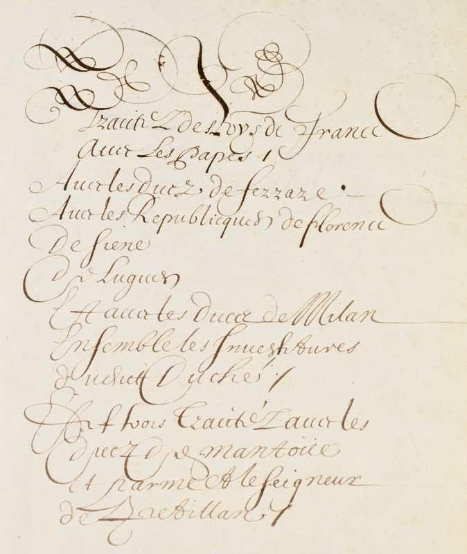 Important recueil diplomatique manuscrit qui réunit 59 traités entre la France et l’Italie du XIVe au XVIe siècle, établi vraisemblablement sous le règne de Louis XIII, entre le traité de Cherasco signé le 6 avril 1631 entre la France, l’empereur Ferdinand II et le duc de Savoie en règlement de la question italienne dans la Valteline et le Traité d’alliance de Rivoli ratifié à l’initiative de Richelieu le 11 juillet 1635 par le duc Victor-Amédée Ier de Savoie, réunissant contre l’Espagne à la fois la France et les ducs de Savoie, de Parme, de Modène et de Mantoue. Contient six parties : I. Traités avec les Papes (de 1514 à 1555) II. Traités avec les Ducs de Ferrare (1527 à 1556) III. Traités avec les Républiques de Florence (1396 à 1557) IV. Traités avec la République de Lucques (1328 à 1396) V. Traités avec les Ducs de Milan et Investitures (1386 à 1516) VI. Traités avec les Ducs de Mantoue, de Parme etc. (1396 à 1551). Au XVIIᵉ siècle, la France, sous l’impulsion de Richelieu et de Louis XIII, adopte une stratégie ambitieuse de retour sur la scène européenne, visant à affaiblir la maison des Habsbourg et à étendre son influence en Italie. Richelieu préconise d’ouvrir des « portes » stratégiques dans les États voisins pour freiner les avancées espagnoles, notamment en Piémont et en Milanais. Ce plan combine conquêtes militaires, alliances locales et revendications juridiques pour légitimer les annexions. En 1630, la France conquiert Pignerol, consolidant sa position en Italie grâce aux traités avec les ducs de Savoie-Piémont, qui instaurent une longue tutelle française sur la région. Richelieu fait aussi rédiger des traités juridiques revendiquant les droits historiques de la France sur ces territoires, comme le Traitté des usurpations des Roys d’Espagne ou les travaux de Pierre Dupuy et Jacques de Cassan. Ces textes servent de véritables armes diplomatiques dans les négociations, notamment lors de la guerre de Trente Ans, où le contexte de bouleversements territoriaux favorise les ambitions françaises. Ainsi, la politique de Richelieu mêle habilement diplomatie, stratégie militaire et légitimation juridique pour renforcer la position de la France face aux Habsbourg et inscrire l’Italie dans son horizon stratégique. Très bel exemplaire aux armes d’Henri-Auguste de Loménie, comte de Brienne (1596-1666) ; maître des cérémonies et prévôt des ordres du Roi du 22 mars 1619 à juillet 1621, créé chevalier du Saint-Esprit, il alla négocier en Angleterre le mariage d’Henriette de France avec le prince de Galles en 1624, reçut en juin 1643 le département des affaires étrangères qu’il céda en 1663 à Hugues de Lionne. Fine reliure décorée à petit fer sur le dos, dans le goût des reliures armoriées exécutées à la même époque par Le Gascon pour les héritiers de Thou (OHR, planche 216-218). Reliure discrètement restaurée. Provenance: René de Galard de Béarn, marquis de Brassac (1699-1767) compositeur, lieutenant général des armées du roi, avec ex-libris armorié (vente 1920, IIe partie, n°111). Olivier-Hermal-Roton, planche 1075 ; Ferretti, Giuliano. « La politique italienne de la France et le duché de Savoie au temps de Richelieu », Dix-septième siècle, vol. 262, n°1, 2014, pp. 7-20.