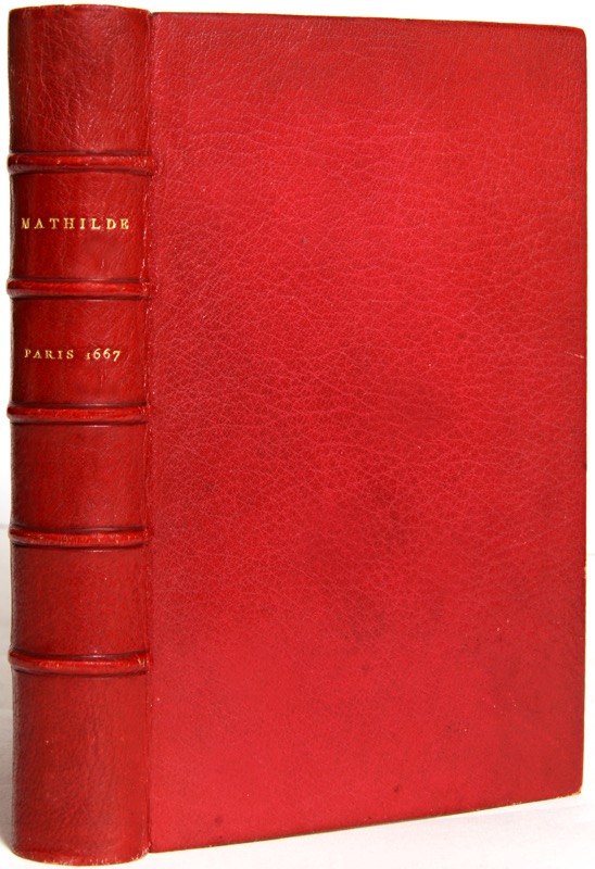 Édition originale illustrée d’un frontispice gravé d’après Chauveau, accompagnée de l’importante préface intitulée Les Jeux, servant de préface à Mathilde. « Non pas vraiment inconnue, mais plutôt méconnue, la nouvelle que fit paraître Madeleine de Scudéry en 1667 devrait pourtant connaître un autre sort. En effet, loin d’être alors un auteur sur le déclin, la romancière (1607-1701) y démontre ses qualités traditionnelles jointes à une audace littéraire – voire politique – qui surprend. En ressuscitant Laure et Pétrarque, elle fonde la légitimité historique du courant galant ; en racontant les amours d’Alphonse et de Mathilde dans l’Espagne sanglante du XIVe siècle, elle entrelace idylle galante et intrigues de cour, amour et ambition, comme le fera onze ans plus tard Mme de Lafayette dans La Princesse de Clèves; enfin, jouant de la fiction du non-fictif, elle va jusqu’à donner à son écriture historique des accents critiques étonnants. Frappée de mutisme pendant cinq ans à la suite de l’affaire Foucquet, Madeleine de Scudéry recommença à publier avec Mathilde, dont le texte constitue un des sommets de l’art de la romancière » (Nathalie Grande, édition moderne Honoré Champion). Le roman fut réédité sous le titre Mathilde d’Aguilar, histoire galante (1702). Provenance : baron Léopold Double (deux ex-libris dont une croix potencée, le second Ex museo L. Double), bibliophile et grand collectionneur, acquéreur en 1848 de la bibliothèque de Louis XIV ; Lucien Scheler, « Coll.complet » paraphé. Très bel exemplaire relié en maroquin janséniste rouge signé Chambolle-Duru. Tchemerzine-Scheler, V, p.786 ; Lever, Fiction narrative en prose au XVIIe siècle, p. 261 ; Catalogue de la bibliothèque M. Léopold Double, 1863, n° 204, acheté par le comte du Tillet pour 131 francs : Superbe exemplaire d’un volume rare.