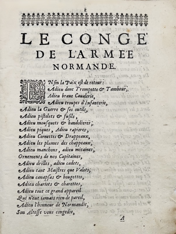 Pamphlet en vers attribué par Édouard Frère à l’imprimeur-libraire et poète de Rouen David Ferrand (1589-1660) publié la même année sous le titre augmenté « Le Congé burlesque de l’armée normande ». Moreau : « Il existe de cette pièce une édition sans lieu ni date de 4 pages. L’épithète de Burlesque ne se trouve pas au titre. Est-ce l’édition originale ? ». Moreau, Mazarinades, 752 ; Frère, I, 463.