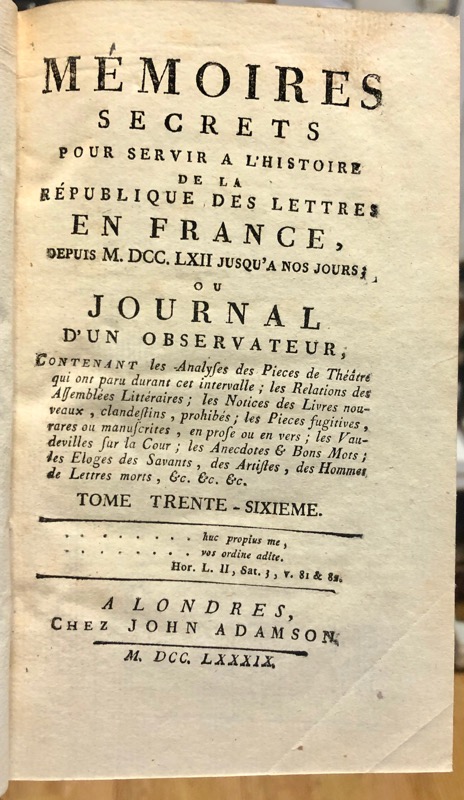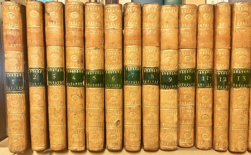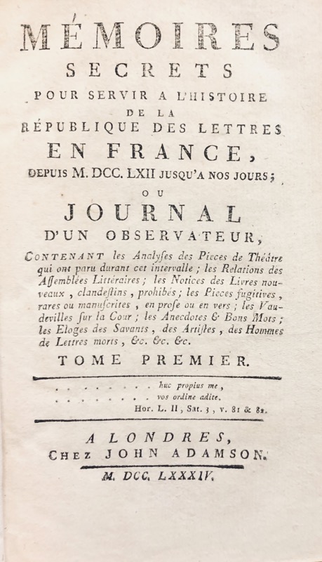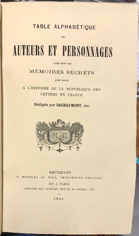 Source de tout premier ordre pour l’histoire de la seconde moitié du dix-huitième siècle. Bachaumont vivait chez une dame Doublet qui tenait un salon célèbre où les plus illustres personnages de l’époque se côtoyaient. On y élabora tous les jours, de 1762 à 1769, un journal on l’on insérait à leur date les nouvelles courantes après les avoir discutées et examinées soigneusement. Après le décès de Bachaumont, en 1771, le journal fut racheté et continué jusqu’au 31 décembre 1787, par diverses personnes, entre autres l’avocat Mouffle d’Angerville, et Pidansat de Mairobert, familier de la maison Doublet, secrétaire des commandements du duc de Chartres. Ce fut seulement en 1777 à Londres que l’ouvrage commença à être publié ; les neuf premiers volumes parurent dans le cours de l’année, puis ensuite au rythme d’un par an. Il y eut plusieurs tirages. On joint le volume de table publié en 1866 et indispensable à l’utilisation des Mémoires secrets. Bel exemplaire en reliure d’époque. Hatin, 66-67 ; Sgard, 904.