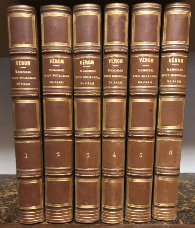 Édition originale. Véron souhaitait devenir le mémorialiste de Paris au XIXe siècle dans la lignée de L’Estoile et de Barbier. Rédacteur à la Quotidienne en 1828, fondateur de la Revue de Paris en 1829, il consacra près de la moitié de ses mémoires à la fin de l’Empire et à la Restauration. On y trouve de nombreux portraits d’hommes politiques ou de lettres, d’artistes, de médecins, de très nombreuses anecdotes. La fin de l’Empire – La Restauration – La Monarchie de Juillet – La République jusqu’au rétablissement de l’Empire. Quelques pâles rousseurs, sinon bel exemplaire. Tulard, 1476 ; Bertier, 986 ; Vicaire VII, 1019.