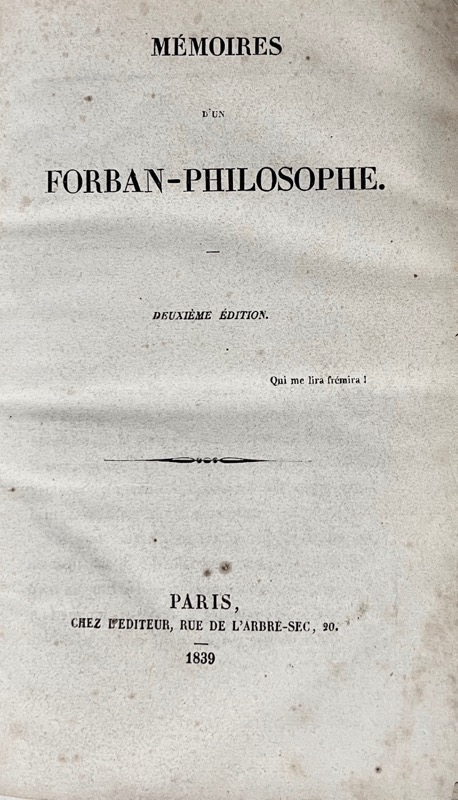 Édition originale avec titre de relais à la date de 1839 et mention de deuxième édition. L’ouvrage fut supprimé dès sa parution. L’éditeur précise dans sa préface : « Le lecteur qui se nourrit des Mémoires de Vidocq et de ses familiers pourra-t-il goûter les charmes des productions d’une imagination réglée et brillante ? Non sans doute : il faut pour dessiller ses yeux, pour le détourner de la fausse route, il faut qu’il voie l’horreur jusque dans sa dégoûtante nudité (…). Les Mémoires d’un Forban philosophe peuvent en ce sens être considérés comme un véritable antidote contre la dépravation du goût ; c’est le dernier degré d’horreur auquel on puisse arriver. Jamais on a produit rien de plus épouvantable : licence de la soldatesque, débordements des lieux de débauche, infamies des prisons et des galères, meurtres, crimes, trahisons, assassinats. L’éditeur espère que ces Mémoires seront le dernier sacrifice offert au goût du jour, et que la littérature des criminels sur son déclin pâlira désormais devant le dégoût du public éclairé ». Ce roman virulent et subversif est, pour partie, rédigé en argot. Il est célèbre pour avoir été utilisé par Victor Hugo dans Les Misérables et dans Le Dernier Jour d’un condamné. Dans l’inventaire de la bibliothèque de Victor Hugo à Guernesey, rédigé par Julie Chenay, l’ouvrage est attribué à un certain R. Buchez. « Les Mémoires d’un forban philosophe ne sont autre chose que la vie d’un marin célèbre qui a passé par toutes les étamines : infamie des prisons et des galères, meurtres, crimes, trahisons, assassinats, tout s’y trouve mis au grand jour par l’auteur lui-même, qui rachète en quelque sorte ses forfaits par des réflexions philosophiques, trop hardies, sans doute, mais qui relèvent toujours son récit » (catalogue de l’éditeur en 1835). Cellard, Anthologie de la littérature argotique, p. 103 : « L’histoire de l’ouvrage est enveloppée d’obscurité. Sitôt paru, il est saisi et détruit par la police de Charles X ; non pas pour des raisons de convenance sociale (l’argot et le récit lui-même), mais pour des raisons politiques. Inconnu de nous jusqu’à de meilleures recherches, l’auteur ne l’était certainement pas de la police royale, qui devait le tenir à juste titre pour un républicain dangereux ». Bon exemplaire. Quelques rousseurs. Yve-Plessis, Bibliographie raisonnée de l’argot, nº120 : « Cet ouvrage fut supprimé dès son apparition. On y rencontre beaucoup de passages argotiques ».