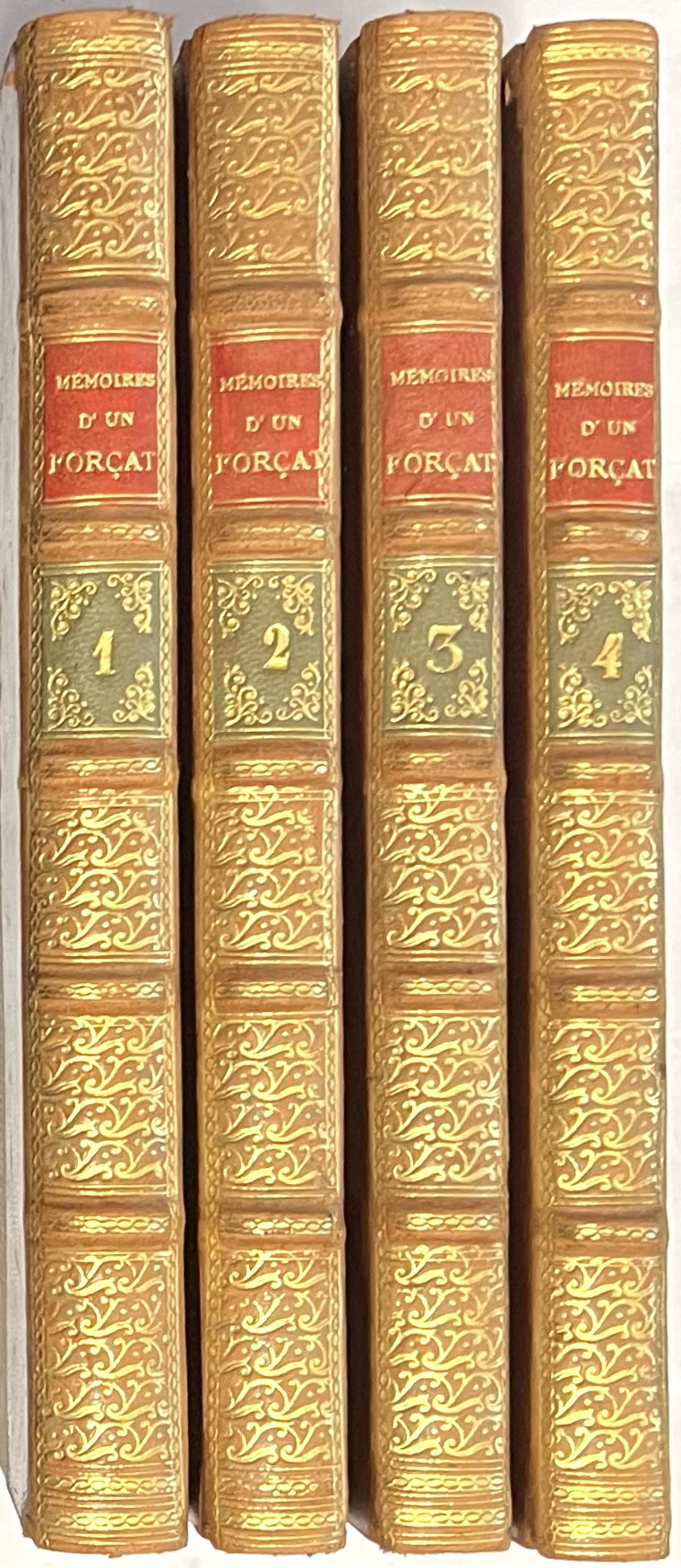 Édition originale de ces mémoires apocryphes d’un forçat anonyme qui « semble n’avoir qu’une idée fixe, celle d’écrire non sa vie, mais la vie d’un homme vers lequel une espèce de fatalité le poussa pendant longtemps ; il parle peu de lui-même et beaucoup de M. Vidocq ». Les différents éditeurs pour les quatre tomes et la curieuse pagination du tome III qui contient deux préfaces pour une, s’expliquent par la faillite du premier éditeur, Langlois, et par le procès des auteurs avec le second, Rapilly. A la page 307 du tome IV, commence un lexique d’argot qui court jusqu’à la fin. Barbier III, 188 ; Yve-Plessis 119 ; inconnu de Tulard et Le Clère. Rousseurs.