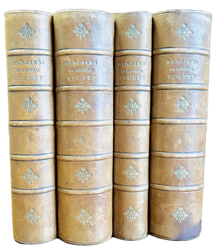 Tulard, 1271 : « La période consulaire est abordée à partir du tome II avec la campagne d’Italie de 1800. Dans ce volume, on retiendra la vie de garnison à Paris de 1801 à 1803 (un bal chez Moreau, la formation d’une bibliothèque, la garde municipale, la solde, les exercices). Le tome III concerne la formation de la Grande Armée et les campagnes de 1805-1809. Le tome IV relate la chute de l’Empire. Peu d’effets de style, une relation précise, sans recherche, des événements ». « Roguet commence sa carrière militaire en 1792 à Nice, participe en 1793 aux opérations de l’armée du Var et au siège de Toulon, puis à partir de 1794, à la guerre en Italie » ( Fierro, 1279). Bon exemplaire de ces excellents mémoires. Dos passé.