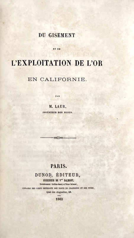 In-8 de (4)-147 pp., figures dans le texte. LAUR (P.). Du gisement et de l’exploitation de l’or en Californie. Paris, Dunod, 1863. In-8 de (4)-89 pp., 6 planches repliées hors texte. Les deux pièces reliées en 1 vol. in-8, demi-chagrin vert, dos orné à nerfs (reliure de l’époque).
