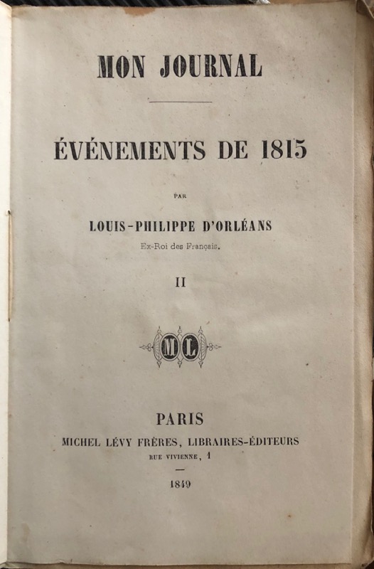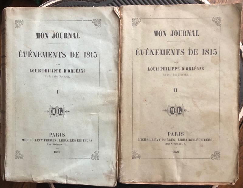 Édition originale. Tulard, 918 : « Publié en 1849, ce journal donne jour par jour du 5 au 24 mars les réactions de Louis-Philippe alors duc d’Orléans, devant le retour de Napoléon de l’île d’Elbe. Témoignage passionnant mais il convient de ne l’utiliser qu’avec les plus grandes précautions. »