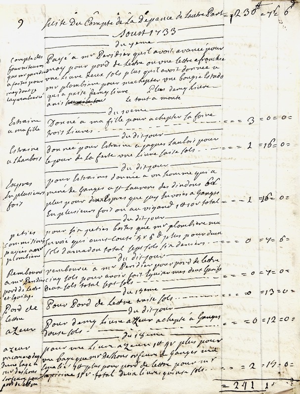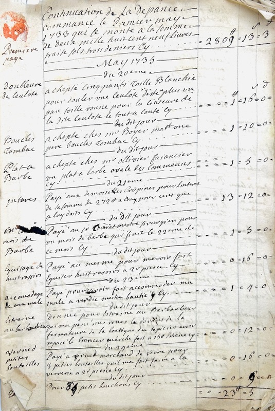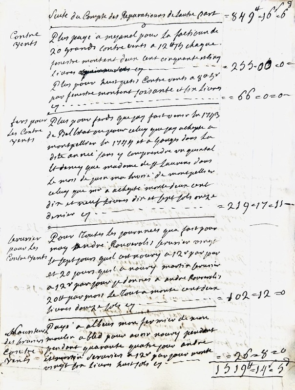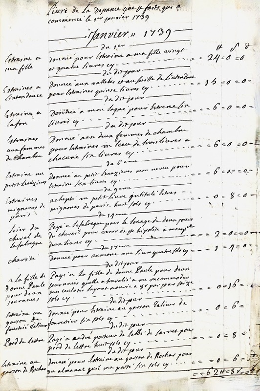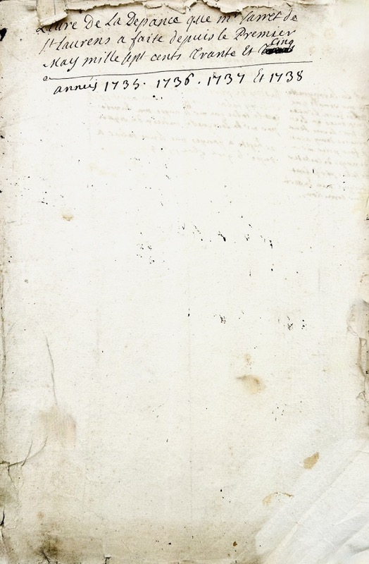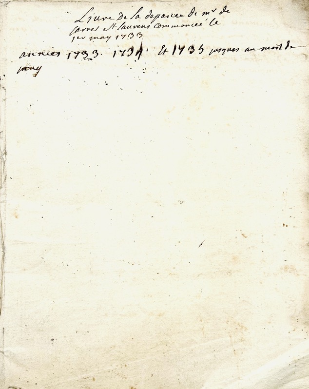 Livre de la depence de Mr Favret St Laurens commancée le 1er may 1733. Années 1733. 1734 et 1735 jusques au mois de may. In-4 de 68 pp. [Verso du dernier feuillet : Livre de la recepte de Mr Favret St Laurens commancée le Premier may mille sept cents trante et trois. In-4 manuscrit de 5 pp.]. J’ay commancé mon tabac a rapé que Lacam ma porté de Paris le 27eme xbre 1731 y compris celuy que j’avais il y a en tout pois de montpellier quinze livres et demy. Mr de Régnac maporte duex carotes tabac faisant pois de montpellier sept livres… Livre de la Depance que Mr Favret de St Laurens a faite depuis le Premier May mille sept cents trante et cinq. Années 1735. 1736. 1737 et 1738. In-4 broché de 78 pp. Titre de départ : Continuation de la depance commancé le Premier May 1733 qui se monte à la somme de deux mille huit cent neuf livres traise sols trois deniers cy [Verso du dernier feuillet : Livre de la recette que Mr Favret de St Laurens a faite commencée le premier may mille sept cents trente trois / jay arraché les deux feules quimanquent a ce registre parce que cestoit la recepte que jay couché pourt un caier qui est dans mon portefeuille]. Livre de la depance que jay faite qui a copmmencé le Premier janvier 1739. [Au verso du dernier feuillet : ce patot contient toutes les dépanses que jay faites depuis le 1er may 1733 et les années suivantes 1734 1735 1736 1737 et 1738.] Fin : La depance que jay faite depuis le premier janvier 1739 jusques au dernier décembre mille sept cents quarante et un se porta à la somme de deux mille neuf cents septante livres cin sols onze deniers. In-4 de (2)-48-(31) pp. Livre des réparations commencées en lannée 1742 continuées et finies en lannée 1744 au mois de septembre. In-4 de (14) ff.