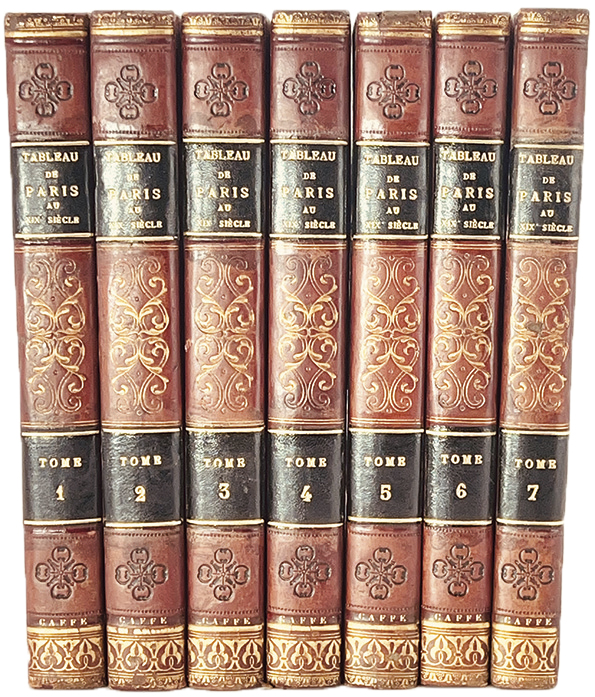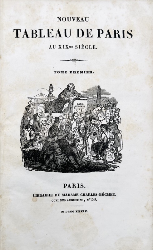 Édition originale de ce recueil collectif. « La publication a été inspirée par le succès que venait d’obtenir, peu auparavant, Paris ou Le Livre des Cent-et-un, 1831-1834. Le Nouveau Tableau de Paris n’est pas moins important ni moins intéressant que son devancier. On remarque parmi les collaborateurs plusieurs écrivains de valeur » (Lacombe). Les notices contenues sont de Honoré de Balzac, Henry Martin, Léon Gozlan, Paul de Kock, Louis Reybaud, F. Davin, Émile Deschamps, Alphonse Karr, Auguste Luchet, Charles Reybaud, Maurice Alhoy, Michel Raymond, d’Antonnelle, Achille de Vaulabelle, Ernest Desprez, Théodore Muret, Altaroche, N. Brazier, Frédéric Soulié, Richard, Félix Pyat, Michel Masson, Albert des Étangs, A. Jal, P.-L. Jacob, Duverger, Jules Janin, Cordelier-Delanoue, Édouard Monnais, Samson, James Rousseau, Merville, J. Anthony, L. Huart, H. Fortoul, Gustave Planche, Raymond Brucker, Charles Didier, Ad. Jubinal, Philarète Chasles, Bert, Eugène Briffaut, Frédéric de Courcy, Bertheaud, Prosper Lucas, Charles Dégleny, Pigault-Lebrun, Chabot, J. Arago, Gaussuron-Despréaux, Alph. Leclerc, Durocher, Mnneville et P.-L.-B. Caffe. Vignette de Tellier gravée sur bois par Porret sur chaque feuillet de titre à partir du tome II. Bel exemplaire malgré des rousseurs. Provenance : Paul-Louis-Balthasar Caffe (1803-1876), médecin savoyard et érudit, collaborateur du présent ouvrage. Lacombe, Bibliographie Parisienne, 695 ; Vicaire VI, 240.