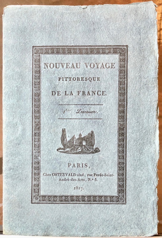 Exceptionnel exemplaire en livraisons à l’état de neuf. Les compositions de Bence, Bourgeois, Chapuy, Baugean, Goblain, etc., ont été gravées sur acier. « Cette publication et son succès encouragent le ministre de l’Intérieur, Decazes, à demander aux préfets un rapport sur les monuments intéressants de leur département, afin de les protéger, car on s’aperçoit que d’innombrables monuments gothiques ont été achetés par des Anglais, qui les ont transportés dans leur pays » (Adhémar). « Le Nouveau voyage pittoresque de la France, publié par Ostervald l’aîné entre 1817 et 1824, se compose de 360 gravures sur acier accompagnées chacune d’une brève notice. Si l’ouvrage se situe dans la continuité des voyages pittoresques illustrés du siècle précédent, il en renouvelle néanmoins le genre et ce par deux innovations remarquables. Les monuments représentés sont en effet majoritairement médiévaux, choix qui témoigne de l’intérêt qu’ils commencent à susciter depuis le début du siècle. L’ouvrage présente donc les principales richesses de la France en indiquant ce qu’il faut voir et comment. Il établit ainsi, avant les Voyages pittoresques et romantiques de Taylor et Nodier, un code du regard pour les antiquités nationales » (P. Rodriguez). Très bel exemplaire décrit dans le catalogue Heilbrun, Topographie française, n°214.