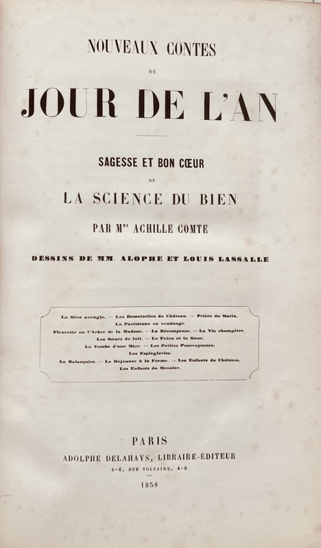 16 contes illustrée de 16 lithographies hors texte d’après les desseins de MM. Adolphe et Louis Lassalle. La Mère aveugle – Les Demoiselles du Château – Prière du Matin – La Parisienne en vendang – Fleurette ou l ‘ Arbre de la Madone – La Récompense – La Vie Champêtre – Les Soeurs de lait – le Frère et la Soeur – La Tombe d’une Mère – Les Petites Pourvoyeuses – Les Espiègleries – La Balançoire – Le Déjeuner à la ferme – Les Enfants du Château – Les Enfants du Meunier. Bel exemplaire malgré des rousseurs.