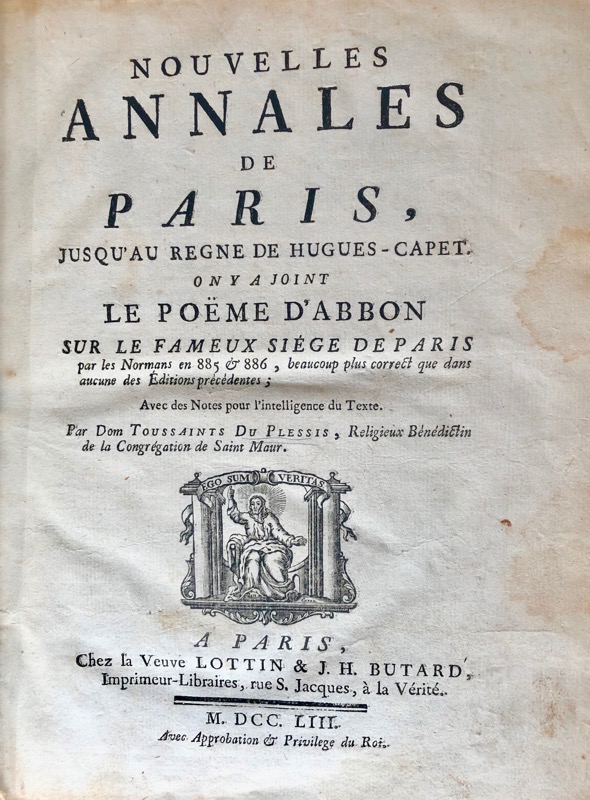 Édition originale. Bénédictin de la congrégation de Saint- Maur, Du Plessis (1689-1767) eu la charge de la bibliothèque publique d’Orléans puis fut nommé bibliothécaire de l’abbaye de Saint-Germain, il se retira dans l’abbaye de Saint-Denis ; cet chronique du Haut Moyen-Age s’inscrit pleinement dans les travaux des mauristes réputé pour leur sens critique et leur rigueur ; remarquable étude sur les écoles de Paris sous le règne de Charlemagne. Très fouillé et minutieux appareil critique en français du poëme d’Abbon de Saint-Germain-des-Prés (v. 850- v. 922), principale source historique sur cette expédition guerrière des Vikings contre la capital. Catalogue Bossuet, 137 ; Catalogue Dufour, 184. 1 mors et coins abimés.