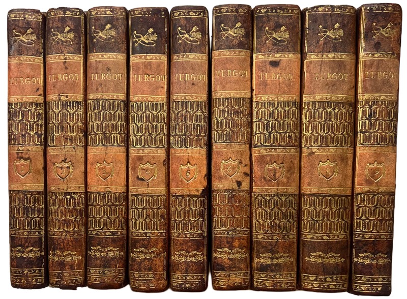 Première édition collective des oeuvres de Turgot rassemblées par Dupont de Nemours qui a rédigé les préfaces et les avertissements. Par suite des renvois aux pièces justificatives figurant dans les autres tomes, le tome I a été publié le dernier, d’après l’Avis imprimé en tête du tome II. Portrait de Turgot en frontispice gravé par Tardieu d’après Ducreux I. [DUPONT DE NEMOURS, Pierre-Samuel] Mémoires sur la vie, l’administration et les ouvrages de M. Turgot, Ministre d’État. II. Lettre à M. l’abbé de Cicé, depuis évêque d’Auxerre, sur le papier suppléé à la monnoie ; Discours pour l’ouverture et la clôture des Sorbonniques ; Premier discours sur les avantages que l’établissement du christianisme a procurés au genre humain prononcé le 3 juillet 1750 ; Second discours sur les progrès successifs de l’esprit humain, prononcé le 11 décembre 1750 ; Lettre à M. de Buffon sur sa théorie de la terre ; Remarques critiques sur les Réflexions philosophiques sur l’origine des langues et la signification des mots de M. de Maupertuis par M. Turgot, avec les Réflexions en regard ; Projets et plans d’ouvrages : sur la géographie politique, sur l’histoire universelle, sur les progrès de l’esprit humain, sur les progrès et les diverses époques de décadence des sciences et des arts, Pensées et fragmens ; Lettres sur la tolérance ; Le Conciliateur. III. Articles de M. Turgot dans l’Encyclopédie (étymologie, existence, expansibilité, foires et marchés, fondation et fondations ; Valeurs et monnoies ; Observations et pensées diverses ; Sur les économistes ; Éloge de M. de Gournay précédé d’une lettre à M. Marmontel ; Observations géologiques ; Lettre à M. de Voltaire. IV. Travaux concernant les impositions : Déclaration du Roi concernant la taille tarifée dans la généralité de Limoges et lettre circulaire de Turgot aux Commissaires aux tailles de cette généralité ; Avis sur l’état de la généralité de Limoges relativement à l’imposition de la taille pour 1762 ; Lettre au contrôleur général pour refuser l’intendance de Lyon ; Mémoire sur les doubles emplois des tailles entre les généralités de Limoges et de La Rochelle ; Projet d’Arrêt du conseil jpoint à ce mémoire ; Projet d’une imposition territoriale : projet d’édit du Roi portant abonnement des vingtièmes…t observations de Turgot ; Plan d’un mémoire sur les impositions en général, sur l’imposition territoriale en particulier et sur le projet du cadastre ; Lettre à M. de Laverdy sur la répartition des vingtièmes ; Avis sur l’imposition de la taille de la généralité de Limoges pour 1763, 1765 et 1766 ; Mémoire sur la surcharge des impositions qu’éprouvoit la généralité de Limoges, dans lequel l’auteur traite incidemment de la grande et de la petite culture ; Programmes de la Société royale d’agriculture de Limoges et observations sur les mémoires de MM. de Saint-Peravy et Graslin ; Suppressions des Corvées ; Lettre sur la corvée pour le passage des troupes ; Lettre aux officiers de police des villes de sa généralité où il y a des marchés de grains ; Mémoire au Conseil d’État sur la législation relative à l’exploitation des mines et des carrières. V. Réflexions sur la formation et la distribution des richesses et observations de Dupont de Nemours sur les points dans lesquels Adam Smith est d’accord avec la théorie de Turgot et sur ceux dans lesquels il s’en est écarté ; Questions sur la Chine adressées à MM. Ko et Yang ; Lettre à M. Trudaine sur les encouragemens à donner aux manufactures ; réponse de Trudaine et réplique de Turgot ; Avis pour l’imposition de la taille de la généralité de Limoges, des années 1767, 1768 et 1769 ; Lettre sur les améliorations à faire dans le transport des équipages des troupes et dans les étapes ; Avis sur l’imposition de la taille… …1770 ; Mémoire sur les prêts d’argent ; Addition à ce Mémoire sur la nécessité et le prix du Crédit ; Lettre circulaire à MM. les curés de la généralité de Limoges sur les pertes de bestiaux, les modérations de contributions, sur la forme à suivre pour les obtenir, sur les récompenses sur la destruction des loups ; Travaux relatifs à la disette de l’année 1770 : arrêt du Conseil d’État du Roi sur la liberté du commerce des grains en Limousin et Périgord ; Avis et instruction sur l’établissement de bureaux de charité et lettres circulaires à ce sujet à MM. les curés et les subdélégués. VI. Diverses ordonnances, arrêts et pièces d’administration ; Lettres sur la Liberté du Commerce des Grains : ces Lettres sont au nombre de sept ; Lettres sur des actes administratifs ; Sur l’extension de la liberté du commerce des colonies ; Lettre au maire de Rochefort ; Lettre à M. le Marquis de Monteynard, ministre de la guerre sur la milice. VII-VIII. Lettres et mémoires au Roi ; Liberté et franchise du commerce des bleds ; Encouragemens divers pour d’autres branches de culture et de commerce ; Mesures contre la maladie épizootique ; Perfectionnemens dans la levée des contributions ; Adoucissemens dans les rigueurs inutiles de la perception ; Suppressions, ou modérations d’Impôts ; Facilités de perception ; Suppressions d’offices ; Diminution de fraix de régie ; Établissemens de régies nouvelles et perfectionnement des anciennes ; Comptabilité ; Travaux publics ; Payement de dettes anciennes ; Lettres et loix administratives ; Loix de police ; Emprunts du clergé, des pays d’États ou du Trésor public ; Encouragemens pour l’art de guérir et le soulagement des malades. IX. Traductions en vers : De la Prière universelle de Pope ; de celle de Cléanthe ; de Virgile avec texte latin en regard ; Sur la prosodie de la langue française et la versification métrique ; Invocation à la muse d’Homère ; traduction du poème de Didon de l’Énéide de V