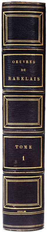 Exemplaire unique tiré sur grand raisin de Chine fort, comprenant chaque figure en 3 états (eau-forte pure sur Chine, état définitif sur Chine et état définitif sur vélin). 2 portraits de l’auteur, une planche dépliante avec les fac-similés des écritures de Rabelais, Henri II et Diane de Poitiers, la carte dépliante du Chinonois, sur Chine, et 10 gravures d’après Devéria – les 2 portraits et les 10 gravures sont ici en trois états : eau-forte pure sur Chine, définitif sur Chine, définitif sur vélin ; 120 figures grotesques des Songes drôlatiques, gravées sur bois par Thompson au tome IX. Importante édition regroupant les notes des plus grands commentateurs de Rabelais, dont Le Duchat et Voltaire ; elle reste inachevée comme le précise Brunet qui indique qu’un dixième volume qui devait contenir la table générale, n’a pas paru. Provenance : bibliothèque Eugène Paillet (ex-libris). Très bel exemplaire cité par Brunet et Vicaire qui notent que cet exemplaire comprenait à l’origine les dessins originaux de Devéria. Quelques piqûres aux planches tirées sur vélin et aux supports de vélin des planches tirées sur Chine. Brunet, IV, 1060; Vicaire VI, 924.