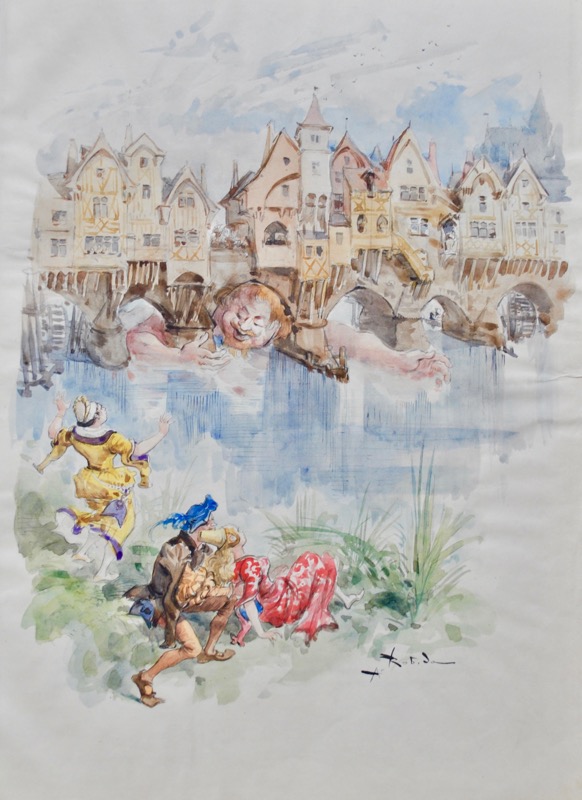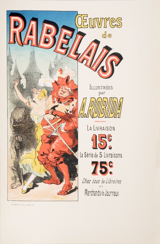 Premier tirage de l’illustration, contenant 49 planches hors texte en couleurs, en noir et en camaïeu, et de nombreuses compositions dans le texte. Un des cent exemplaires sur papier de Chine, numéroté 17. Exemplaire exceptionnel enrichi d’une aquarelle originale signée de Robida à pleine page, de deux couvertures de livraison (la première bleue, la seconde verte), de deux affichettes de librairie gravée en couleurs par Jules Chéret (réduite au format du livre), et des deux affiches de librairie par Chéret reliées à la fin du deuxième volume : CHÉRET (Jules). Affiche lithographiée en couleurs pour les Oeuvres de Rabelais, illustrées par A. Robida. Paris, Imprimerie Chaix, [1885]. Dimensions : 244 x 87 cm. CHÉRET (Jules). Affiche intérieure lithographiée en couleurs pour les Oeuvres de Rabelais, illustrées par A. Robida. [1885]. Dimensions : 127 x 87,5 cm. Ces deux superbes affiches lithographiées par Jules Chéret (1836-1932), parmi ses chefs-d’oeuvre, contribuèrent au grand succès de cette édition. Très bel état. Parfait exemplaire du livre majeur de Robida. Beraldi, Les Graveurs du XIXe siècle, IV, p. 188, n°226-226 bis.