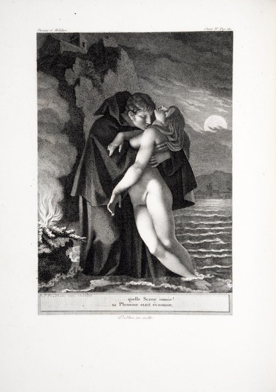 Belle édition sortie des presses de Pierre Didot illustrée de 4 planches d’après les dessins de Pierre-Paul Prud’hon dont l’eau-forte emblématique du romantisme noir Phrosine et Mélidore « seule gravure que le maître ait incontestablement faite » selon Cohen ; les 3 autres figures hors texte sont exécutées à l’eau-forte et au burin par Beisson et Copia. Elles sont toutes avec la lettre. Contient : L’Art d’aimer ; Phrosine et Mélidor ; Poésies diverses. Protégé de Voltaire, Gentil-Bernard (1710-1775) passait pour l’ « Anacréon de la France » ; on retient l’auteur de Castor et Pollux mis en musique par Rameau, mais son nom reste surtout associé aux illustrations de Prud’hon. « En offrant à Prud’hon, qui vivait alors difficilement, des commissions d’illustrations, Didot a largement contribué à le faire connaître au grand public. Gordon Ray signale « l’heureux choix de ses graveurs », Louis Copia et Barthélemy Roger, mais il remarque que le nombre de pièce demandées à Prud’hon étaient toujours minoritaires par rapport à celles de Gérard et Girodet, disciples de David, conseiller principal des Didot, qui n’aimait pas le travail de Prud’hon » (A. Jammes, Les Didot). Très bel exemplaire imprimé sur grand papier vélin d’Angoulême (1/150) relié dans un très rare spécimen de maroquin souple décoré dans le goût de Bisiaux ; ce type de reliure plutôt réservé aux documents manuscrits ou officiels sous l’Empire, reste exceptionnel sur un imprimé. Restaurations discrètes. Cohen-De Ricci, 133 ; Brunet I, 795 ; Rahir, Bibliothèque de l’amateur, p. 109.