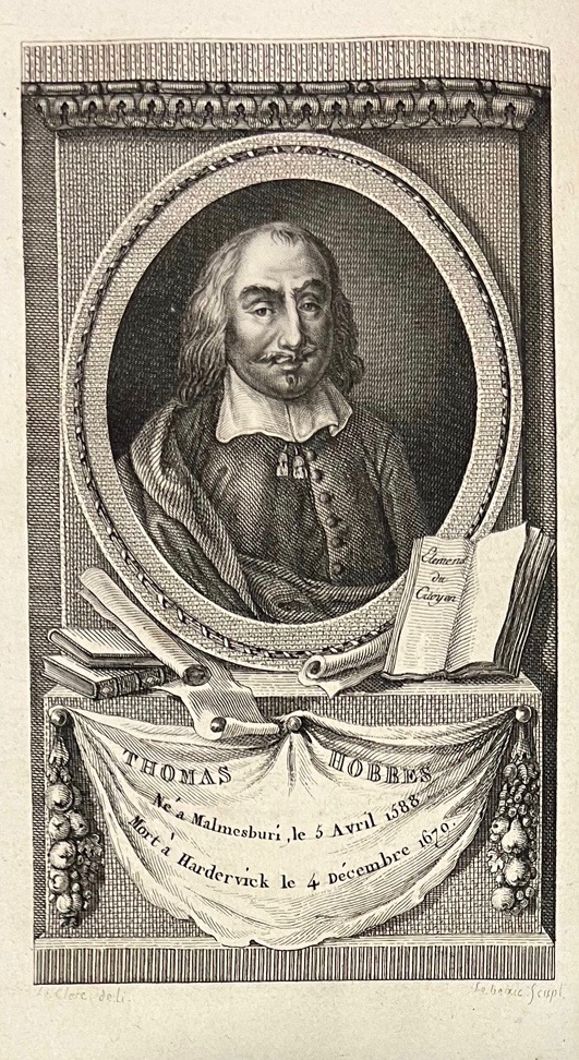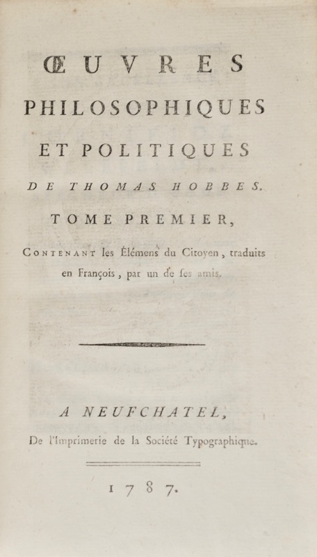 Édition de la traduction de Samuel Sorbière, reprenant aussi la traduction du Traité De la nature humaine faite par Holbach, ici en seconde édition. Tome I : Eléments du Citoyen, traduits par Samuel Sorbière. Tome II : Le Corps politique traduit par Sorbière et La Nature humaine dans la traduction du baron d’Holbach. Portrait de l’auteur gravé sur cuivre par Le Beau d’après Le Clère. Ex-libris (XVIIIe) Claude-Meriadec Pierret Chanterennes, originaire de la ville de Sézanne. Bon exemplaire. Vercruysse, 1772 D1, 1787 D1.