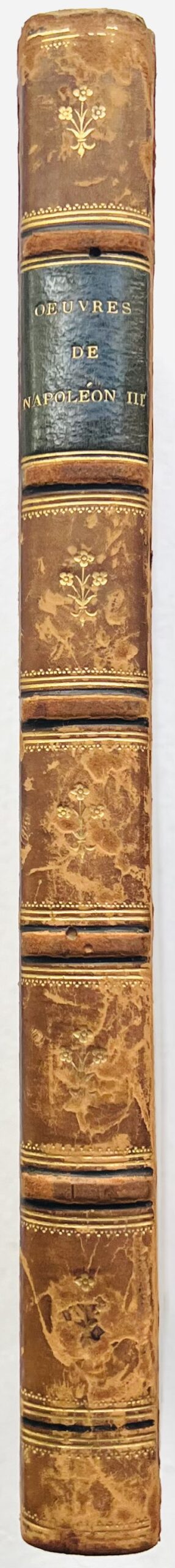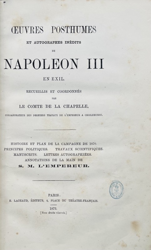 Édition originale établie par le comte Alfred de la Chapelle, collaborateur des derniers travaux de l’empereur à Chislehurst : Histoir e et plan de la campagne de 1870, Principes politiques, travaux scientifiques, lettres autographiées. Annotations de la main de S. M. l’Empereur (fac-similés). Portrait photographique de Napoléon III (vignette). Cachet ancien « Bibliothèque de l’impératrice » (titre) ; étiquette « C C ». Mors fendus, coiffes, dos et coins frottés, quelques rousseurs. Davois, Les Bonaparte littérateurs, p. 57.