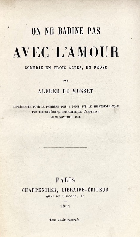 Édition originale posthume et première édition séparée publiée l’année où la pièce fut représentée pour la première fois à la Comédie Française ; la pièce avait paru en 1834 dans la Revue des Deux Mondes (pages 41-92). Ex-libris Pierre Latrobe. Vicaire, V, 1268.