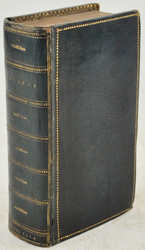 Édition des oeuvres de Tacite établie par Juste Lipse sortie des presses d’Abraham et Bonaventure Elzevier qui signent l’épître dédicatoire à Daniel Heinsius – imprimée une première fois dans l’officine de Leyde en 1621 (extrait de la préface à cette date en tête d’exemplaire : « Postremum Justi Lipsii jan senis de Tacito judicium »). Titre gravé, non signé, et une gravure hors-texte signée de Cornelis Claezoon Duysend (médaillon avec les effigies en profil de l’empereur Auguste, sa femme Livie et Tibère César). Pièces liminaires imprimées en rouge et noir. Réunit : les Annales (p.1-432), les Histoires (p. 433-685), La Germanie (p. 687-712), la Vie d’Agricola (p. 713-744) et le Dialogue des orateurs (p. 745-786). Ex-libris manuscrit sur la garde supérieure (verso) : « Le livre m’a été donné par Mr Georges Thureau Président au tribunal de la Seine, en souvenir de son père Édouard Thureau avocat à la cour de Paris né le 3 novembre 1808, doyen de l’Ordre mort le 18 janvier 1893. Ed. Rons(…) 1894 ». Bel exemplaire en maroquin XVIIIe avec l’inscription Elzevire 1634 en pied de dos. Willems, 415 : « édition fort belle et très recherchée » ; Rahir, n°403.