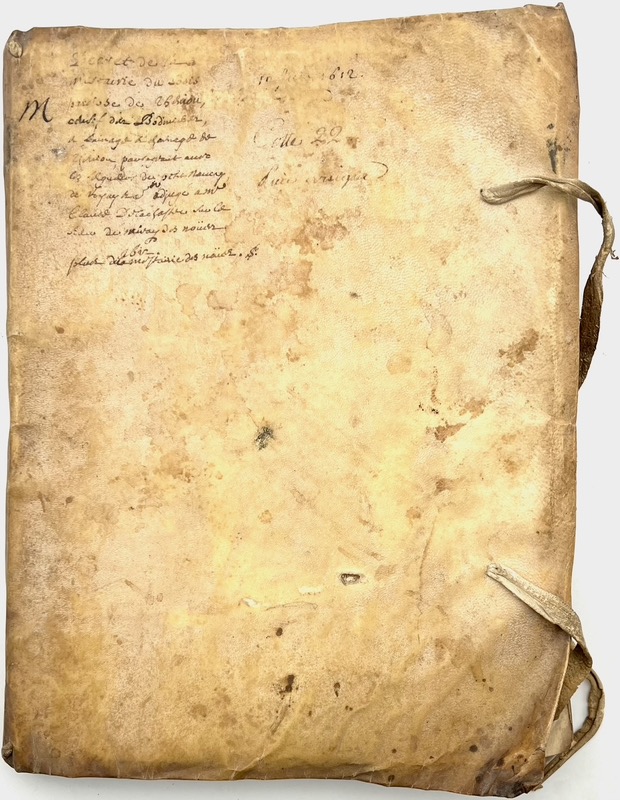 Précieux décret daté 1601 puis 1612 de la métairie du Logis, paroisse de Theniou (aujourd’hui Thénioux dans le Cher) attachée au bailliage de Blois, établi par « messires Louis Descamps et Claude de Mivay des Noües (?) ». Archive manuscrite rédigée sur vélin remarquablement conservée dans sa reliure d’époque sur laquelle a été consigné un sommaire manuscrit à l’encre du temps.