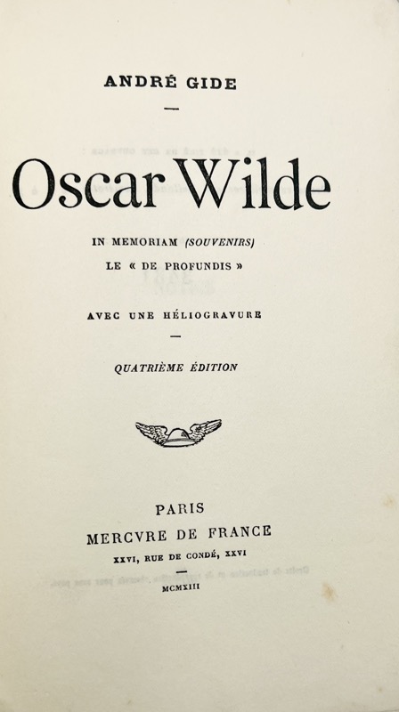 Édition illustrée en frontispice d’un portrait d’Oscar Wilde en héliogravure. La première édition fut imprimée en 1910. « Simple réunion de deux esquisses » publiées l’une dans Prétextes, l’autre dans la revue L’Ermitage, vol. XXXIII, n° 8, 15 août 1905. Le dernier article comporte un extrait traduit sur l’édition du De profundis publiée en Allemagne par Max Meyerfeld. Signature ex-libris (faux-titre).