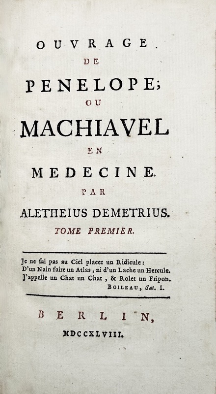 Édition originale. C’est à la suite de la publication de l’Histoire naturelle de l’âme que La Mettrie dut se réfugier à Leyde. Ses attaques combinées contre la religion et la profession médicale lui causèrent tant d’ennemis puissants qu’afin d’échapper à l’arrestation et à l’emprisonnement, il dut s’exiler de lui-même à la cour de Frédéric II où il fut nommé membre de l’Académie royale des sciences. Grace à sa protection royale il put écrire librement cette satire médicale dans laquelle il ridiculise les grands médecins du siècle : Astruc, Boerhaave, Ferrein, Linné, Winslow et d’autres. L’ouvrage de Pénélope ou Machiavel en médecine parut sous le nom d’Aletheius ; il présente un intérêt philosophique indéniable car il pose à la fois, et de manière tout à fait neuve, la question de la compétence des médecins, ainsi que celle du pouvoir de fait de ce corps de doctes. L’auteur y dénonce le machiavélisme de ses pairs, et leur oppose une médecine « anti-machiavélique » qui serait mise au service des citoyens et du public. Bel exemplaire. R. Stoddard, 35 ; DSB VII, 605 ; Quérard I, 896 ; Tchemerzine VI, 46 ; Welcome III, 438 (édition de Genève sans le supplément).