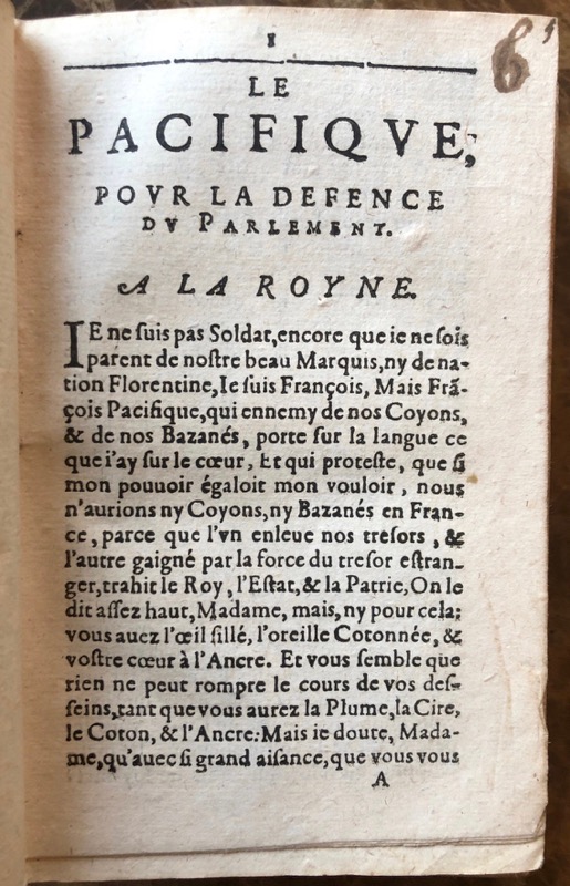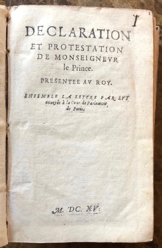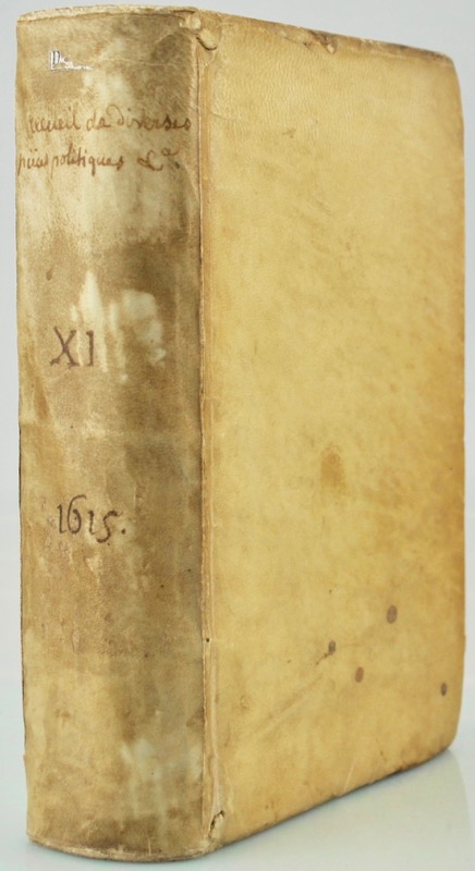 Exceptionnel recueil de pamphlets et d’occasionnels politiques sur la période qui court de la fin des États généraux de 1614 à la seconde révolte de Condé. L’on sait la rareté de chacune de ces pièces en particulier, et leur importance pour la formation d’une opinion publique dans la France de l’époque, troublée par la mort brutale de Henri IV et la renaissance des guerres civiles. Des feuillets déboîtés, une mouillure angulaire à la dernière pièce, mais bon exemplaire. I. CONDÉ (Henri II de Bourbon, prince de) : Déclaration et protestation de Monseigneur le Prince. Présentée au Roy. Ensemble la lettre par luy envoyée à la Cour de Parlement de Paris. S.l., 1615, 40 pp. Il y a plusieurs éditions de ce manifeste, et elles comptent généralement 24 pp. (pour l’une d’une d’entre elles, cf. Welsh I, 566). II. Cassandre françoise. S.l.n.d. [1615], 22 pp. Une des nombreuses éditions de ce pamphlet rédigé dans l’entourage de Condé pour s’opposer aux « mariages espagnols » projetés par la Cour et engager Louis XIII à épouser la duchesse de Montpensier. SHF, Bourgeois & André, 2176. Welsh I, 558. III. Lettre justificative d’un député de Grenoble à Monsieur le Prince. S.l., 1615, 8 pp. Welsh I, 620. IV. La Noblesse françoise, au Chancellier. S.l.n.d. [1615], 7 pp. Welsh I, 636. V. LOUIS XIII : Lettre du Roy à Monsieur le Prince de Condé. Ensemble la responce de Monsieur le Prince au Roy. S.l., 1615, 8 pp. Sur le voyage du roi en Guyenne (juillet 1615). Welsh I, 625. VI. LONGUEVILLE (Henri II d’Orléans duc de) : Lettre de Monseigneur le Duc de Longueville au Roy. S.l., 1615, 7 pp. Contre Concini. Welsh I, 623. VII. Le Pacifique, pour la défence du Parlement. S.l.n.d. [1615], 16 pp. Contre Coton et Concini. Welsh I, 641. VIII. Le Bon Navarrois aux pieds du Roy. S.l., 1615, 13 pp. Véhémente plaquette contre tous ceux qui conseillent au Roi l’alliance avec l’Espagne, et spécialement contre le clergé. SHF, 2177. IX. Martin l’asne aux Parisiens, salut. S.l.n.d. [1615], 7 pp. SHF, 2151. Welsh II, 483. X. Le Protecteur des Princes. S.l.n.d. [1615], 20 pp., manque le titre. Très vive satire adressée à la Reine, faisant l’apologie de Condé et de ses actes, attaquant Concini et Marie de Médicis elle-même. SHF, 2219. XI. [GARASSE (François)] L’Anti-Ioseph, ou bien plaisant et fidelle narré d’un ministre de la religion prétenduë, vendu publiquement à Clérac, ville d’Agenois, ayant esté enfermé dans un coffre par une honeste dame de ladicte ville, à laquelle il faisoit l’amour. Suivant la copie imprimée à Agen, 1615, 16 pp. Rarissime pamphlet du fameux Garasse que Nicéron disait n’avoir jamais vu ; certains bibliographes considèrent l’attribution comme douteuse et en tout cas, il est absent de Welsh. Backer & Sommervogel III, 1192-1193. XII. L’Accomplissement des alliances de France & d’Espagne. S.l., 1615, 16 pp. Un des rares pamphlets qui félicitent Marie de Médicis d’avoir conclu l’alliance avec l’Espagne. SHF, 2201. XIII. Copie d’une lettre d’un prélat député du clergé à l’Assemblée des Estats, sur ce qui s’est passé touchant l’article contentieux, employé pour le premier au cayer du Tiers Estat. S.l., 1615, 8 pp. Contre le fameux article premier du Tiers affirmant la souveraineté du Roi au spirituel même. Welsh I, 568. XIV. Discours sur les conférences faites entre Monseigneur le Prince, Mo[n]sieur de Villeroy, & autres députez de Leurs Majestez. Paris, Anthoine du Brueil, 1615, 16 pp. A propos du refus de Condé d’accompagner Louis XIII dans son voyage à Bordeaux et à Bayonne. SHF, 2221. XV. Extraict des registres du Conseil d’Estat. S.l.n.d. [mai 1615], 6 pp. Absent de Welsh. XVI. La Vérité, la justice, et la paix. Au Roy. S.l., 1615, 11 pp. SHF, 2134. Welsh I, 667. XVII. Remonsrance à la Royne sur les alliances d’Espagne. S.l., 1614, 31 pp, Contre l’alliance espagnole, qui doit être soumise aux Etats Généraux. SHF, 2017. XVIII. Letre escrite par un bon François à un conseiller d’Estat, pour le secours que le Roy est obligé de donner au Duc de Savoye & les autres alliez. S.l., 1615, 16 pp. Absent de Welsh. XIX. Discours sur l’estat présent des affaires de France. Au Roy. S.l., 1615, 42 pp. En faveur de l’alliance espagnole. Welsh I, 583. XX. Le Bon François, contre les libelles. S.l., 1615, 27 pp. Réfutation des pamphlets contre l’alliance espagnole. SHF, 2187. Welsh I, 553. XXI. Les Articles du mariage de dom Philippe d’Espagne et de Madame Elisabeth de France, arrestées à Paris le 20 d’aoust 1612. Par le très-illustre seigneur Duc de Pastrana, & le très-vertueux dom Innego de Cardenas, ambassadeur ordinaire de Sa Majesté Catholique. S. l., 1615, 15 pp. Pas dans Welsh. XXII. Le Patois limosin, à Monsieur le Prince. S.l., 1615, [2]-13 pp. Contre la vénalité des offices. SHF, 2137. Welsh II, 494. XXIII. Advertissement aux provinces, sur la disposition présente des affaires. Paris, Gilbert Le Veau, 1615, 22 pp. Absent de Welsh. XXIV. Histoire prodigieuse du fantosme cavalier solliciteur, qui s’est battu en duel, le 27 janvier 1615, près Paris. S.l.n.d. [1615], 15 pp. Pas dans Welsh. XXV. Advis au Roy, sur la réformation générale des abus qui se commettent en son royaume. S.l., 1614, 16 pp. Pièce préliminaire à la tenue des Etats de 1614. SHF, 2125. Welsh I, 462. XXVI. Harangue au Roy sur la conclusion des Estats. S.l., 1615, 13 pp. SHF, 2117. XXVII. BOUILLON (Henri de La Tour d’Auvergne, duc de) : Lettre au Président Jeannin. S.l.n.d. [juin 1615], 6 pp. Welsh II, 388. XXVIII. Très-humbles remonstrances faictes au Roy par les thrésoriers de France & généraux des finances de son royaume, sur la continuation du droict annuel. Paris, 1615, 14 pp. Sur le renouvellement de la Paulette. Welsh II, 520. XXIX. Manifeste de ce qui se passa dernièrement aux Estats généraux, entre le clergé & le tiers Estat. S.l., 161