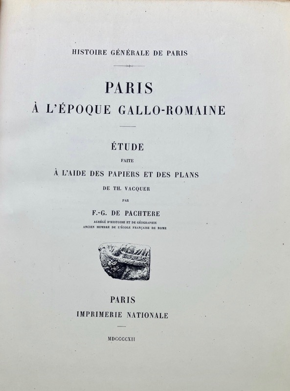 Édition originale. Importante étude sur le Paris gallo-romain établie par Félix-Georges de Pachtère (1881-1916) d’après les papiers et relevés topographiques de Théodore Vacquer (1824-1899), richement illustré de 43 figures dans le texte, 16 planches photographiques et 10 plans hors texte dont le grand plan général de Paris à l’époque gallo romaine. Très bon exemplaire.