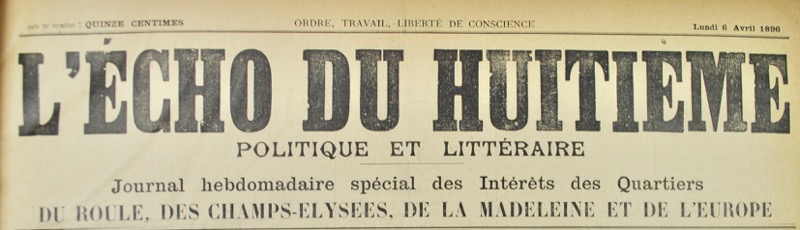 [Paris]. L'Écho du Huitième. Politique et littéraire. Journal hebdomadaire spécial des Intérêts des Quartiers du Roule, des Champs-Élysées, de la Madeleine et de l'Europe.