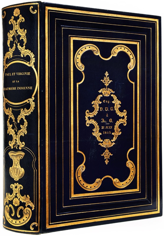 Premier tirage. Compositions in et hors texte d’après Meissonnier, Français, Tony Johannot, Isabey, Paul Huet, Marville, Steinheil, environ 450 bois in texte, 1 carte coloriée et 36 hors-texte avant la lettre sur chine appliqué sous serpentes légendées (sauf le portrait de l’auteur comme il convient) : 7 portraits gravés sur acier et 29 planches gravées sur bois dont le frontispice. Principales particularités de cet exemplaire : à l’adresse de la rue Ste-Anne, avec le texte en tirage mixte, sans le portrait de la « bonne femme » page 418 comme dans certains exemplaire dont celui de l’éditeur, portrait de l’auteur avec la sphère, celui de Mme de La Tour par Tony Johannot, celui du Docteur par un artiste anglais, celui de le jeune bramine sans l’étoile. Provenance : « Eug. V.D.B. à Al. B. 21 juin 1840 » frappé sur le premier plat. Bel exemplaire, frais, avec les bois en excellent tirage et habillé d’une jolie reliure strictement contemporaine de la publication. Quelques très rares rousseurs, serpentes brunies avec décharge sur les supports mais non sur le chine. Carteret III, 532 ; Vicaire VII, 42.