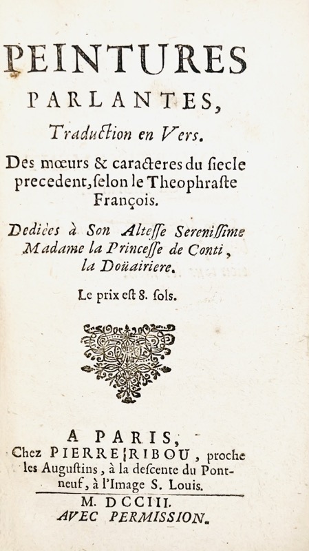 Peintures parlantes. Traduction en vers des moeurs et caractères du siècle précédent, selon le Théophraste françois.