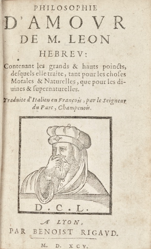 Nouvelle édition de la traduction française de Denis Sauvage publiée une première fois en 1551 des Dialoghi d’amore de Léon l’Hébreu dont l’originale italienne avait paru en 1535 à Rome. Portrait gravé de l’auteur sur le titre (vignette). « Publiés en 1535, après la mort de Léon l’Hébreu, les Dialoghi d’amore connurent un grand succès non seulement en Italie, mais dans toute l’Europe. Le livre fut très vite traduit en hébreu, en espagnol, en français et en anglais. L’auteur relate les entretiens de « l’amoureux et passionné Philon » avec sa « sage Sophie », entretiens qui portent successivement sur l’essence de l’amour et du désir dans le Dialogue I, sur son universalité dans le second, et sur son origine et sa naissance dans le troisième. Né à Lisbonne en 1460, Léon l’Hébreu alias Juda Abravanel suivit son père Isaac Abravanel, financier érudit et figure légendaire du judaïsme ibérique, à Naples et devint médecin à la cour du vice-roi. Connu pour ses travaux de philosophie et de poésie, il enseigna à Rome et dans d’autres villes d’Italie. Les Dialogues d’amour constituent son oeuvre majeure et sont marqués par la double influence de l’École néo-platonicienne de Florence, notamment de Ficin et de Pic de la Mirandole et de la philosophie juive médiévale placée sous l’égide Maïmonide et d’Ibn Gabirol » (Chantal Jacquet). Provenance : bibliothèque de Hyacinthe Théodore Baron (1707-1787) avec son ex-libris armorié et la devise « Mihi Res non Me Rebus », doyen de la faculté de médecine de l’Hôtel-Dieu de Paris de 1750 à 1753, premier médecin des armées du roi en Allemagne et en Italie., il fut nommé en 1752 membre de l’Académie des sciences et laissa plusieurs ouvrages de médecine. Exemplaire rogné court en tête, traces de frottements sur la reliure, quelques rousseurs. Brunet, III, 984 ; Baudrier, III, 441 ; Gay, I, 891 ; Caillet, I, 2-11. Guaita, 1550 ; Chantal Jacquet, L’Essence de l’amour dans les Dialogues d’Amour de Léon l’Hébreu et dans le Court Traité in Spinoza et la Renaissance de Saverio Ansaldi (2007) ; Catalogue de la bibliothèque de feu M. Baron (1788) n°507.