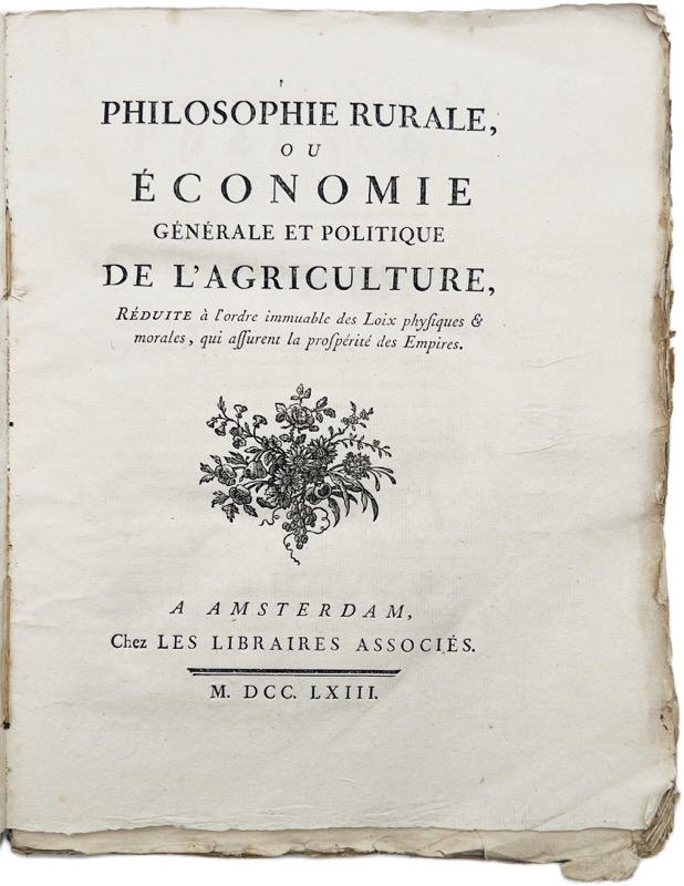 Édition originale d’une grande rareté. Exposé le plus complet et le plus authentique du système physiocratique considéré dans son ensemble. Le Tableau économique gravé sur cuivre (page 1) est répété aux pages 36 et 118. Fruit d’une intime collaboration entre Mirabeau et Quesnay, le tirte primitif de l’ouvrage était Grand tableau économique. Mirabeau reprit exactement « les objets à considérer » énumérés en tête du Tableau économique de Quesnay : trois sortes de dépenses ; leur source, leurs avances, leur distribution, leur effets, leur reproduction ; leurs rapport entre elles, avec la population, avec l’agriculture, l’industrie, le commerce, et avec la masse des richesses d’une nation ». Le septième chapitre, Rapports des dépenses entre elles, est de la main de Quesnay. « L’ouvrage, écrit par Mirabeau et Quesnay (avec la contribution de Butré), est un livre majeur de l’économie politique. Par l’importance de la synthèse qu’elle propose, la Philosophie rurale peut être comparée à La Richesse des Nations d’Adam Smith ou aux Principes de l’Economie politique et de l’impôt de David Ricardo » (R. Dupuy et P. Le Masne). Très bel exemplaire à toutes marges, tel que paru. Kress, 6207 ; INED, 3204 ; Tchemerzine-Scheler IV, 752a.