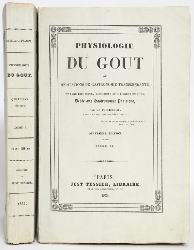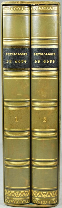 Quatrième édition publiée huit ans après l’édition originale. Rédigé avec un extraordinaire brio, le livre n’est plus à présenter, tant sur le plan philosophique que comme manifeste d’une « école » gastronomique. L’auteur, grave magistrat du Tribunal de Cassation, ne put jouir longtemps du succès de son livre : il mourut le 2 février 1826. Parmi maints aphorismes éblouissants, n’en retenons qu’un, si contraire aux tendances modernes en matière de goût et de beauté : « La maigreur n’est pas un grand désavantage chez les hommes ; ils n’en ont pas moins de vigueur, et sont beaucoup plus disposés. Mais elle est un malheur effroyable pour les femmes ; car pour elles, la beauté est plus que la vie : et la beauté consiste surtout dans la rondeur des formes et la courbure gracieuse des lignes avec les chétives, il n’y a point de remède pour les femmes qui sont nées maigres et qui ont l’estomac bon, nous ne voyons pas quelles êtres plus difficiles à engraisser que des poulardes ; et s’il faut y mettre un peu plus de temps, c’est que les femmes ont l’estomac comparativement plus petit, et ne peuvent pas être soumises à un régime rigoureux et ponctuellement exécuté, comme ces animaux dévoués ». Bon exemplaire malgré quelques rousseurs.