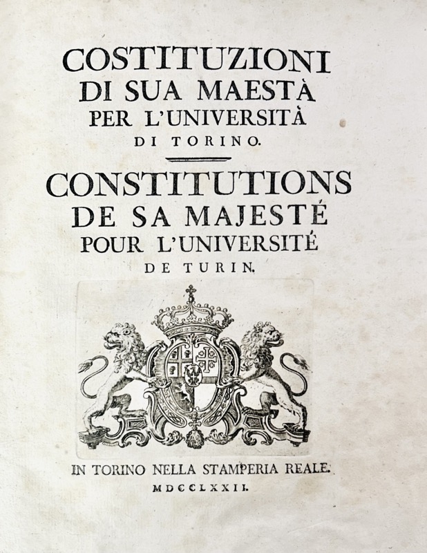 Édition originale bilingue, italien et français. « Les constitutions de l’université de Turin, qui furent édictées par Charles-Emmanuel III (1772), sont encore aujourd’hui un monument de haute sagesse, et l’on ne peut lire sans admiration les termes nobles et sévères qui fixent les attributions du magistrat de la réforme, à qui ces constitutions donnaient la haute direction de l’enseignement. Cette forte organisation de l’université de Turin paraît avoir produit un grand effet sur l’empereur Napoléon et n’avoir pas été sans influence sur le système qu’il inaugura en France. Nous trouvons cette impression indiquée par M. Rendu dans le passage suivant de son code universitaire : « Bonaparte passait à Turin. Un jour qu’il parcourait le palais de l’université fondée en 1720 par Victor-Amédée II, il se fit présenter les statuts qui régissaient cette institution. Il y vit quelque chose de grand et de fort qui le frappa. Cette grave autorité qui sous le nom de magistrat de la réforme gouvernait tout le corps enseignant, ce corps lui-même uni par des doctrines communes et librement soumis à des obligations purement civiles qui le consacraient à l’instruction de la jeunesse comme à l’un des principaux services de l’état, cet ordre de professeurs tous choisis parmi des agrégés nommés au concours, cette noble confiance de la puissance souveraine qui donnait au conseil chargé de la direction générale un droit permanent de législation intérieure et de continuel perfectionnement, tout ce plan d’éducation établi sur la base antique et impérissable de la foi chrétienne, tout cela lui plut, et il en garda le souvenir jusqu’au sein de ses triomphes ». » Ce remarquable passage, que nous avons voulu reproduire, offre un tableau saisissant de l’antique organisation scolaire du Piémont. » (Revue Des Deux Mondes-1863, p. 727). Ex-libris manuscrit sur la garde : Constitutions Royales pour l’Université de Turins (sic) appartenant à la Communauté de St. Paul. Baud secrétaire. Traces de mouillure sur les plats mais très bon exemplaire.