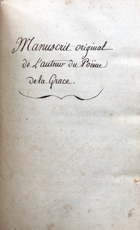 Copie manuscrite de la deuxième édition du Poème sur la Grâce de Louis Racine, annotée et corrigée par l’auteur. L’édition originale parut en 1720 suivie d’une deuxième édition (1722) augmentée de l’Épître à Valincour et d’un apparat critique ; de nombreuses éditions furent publiées par la suite. La copie – certainement effectuée par un secrétaire -, repassée à l’encre, est parfaitement lisible. 25 vers, mots ou hémistiches sont biffés par l’auteur au profit de corrections parfois insérées entre les titres de chapitre et le texte ; quelques vers sont ajoutés. Louis Racine (1692-1763) composa ce poème à la Maison de Notre-Dame des Vertus, dans le temps où, comme pensionnaire de la congrégation de l’Oratoire (1715), il y avait pris l’habit ecclésiastique, après avoir été reçu avocat. Il le remania plusieurs fois par la suite. Le Poème est suivi d’un Post-propos signé « Jean-Louis (Racine) » et de larges extraits de l’Imitation de Jésus-Christ par Thomas a Kempis. Relié en tête : La Religion, Poëme. A Paris, Chez Jean-Baptiste Coignard, Jean Desaint, 1742. In-8 de XVI-206-(2) pp. Édition originale suivie du Jugement de M. Rousseau sur le poème de La Religion, d’une Epître de M. Rousseau, et de la Réponse de M. Racine. Vignette sur le titre gravée par Charles-Nicolas Cochin. Brunet, IV, 1083 ; Quérard, VII, 427.