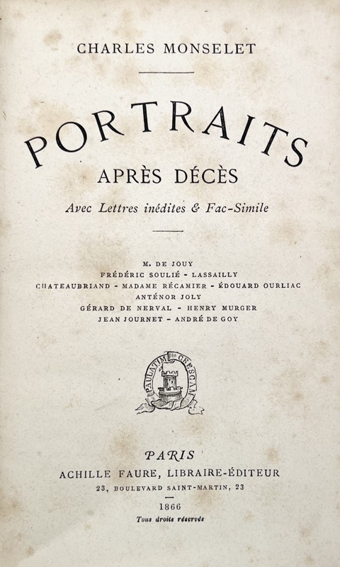 Édition en partie originale, certaines notices ayant déjà paru dans Statues et statuettes contemporaines (1852). M. de Jouy ; Frédéric Soulié ; Lassailly ; Châteaubriand ; Madame Récamier ; Edouard Ourliac ; Anténor Joly ; Gérard de Nerval avec un fac-similé dépliant de l’écriture de l’auteur ; Henry Murger ; Jean Journet ; André de Goy. En 1876, l’ensemble sera repris sous le nouveau titre Les Ressuscités. Ex-libris « J. Fresson ». Pâles rousseurs. Vicaire V, 1048.
