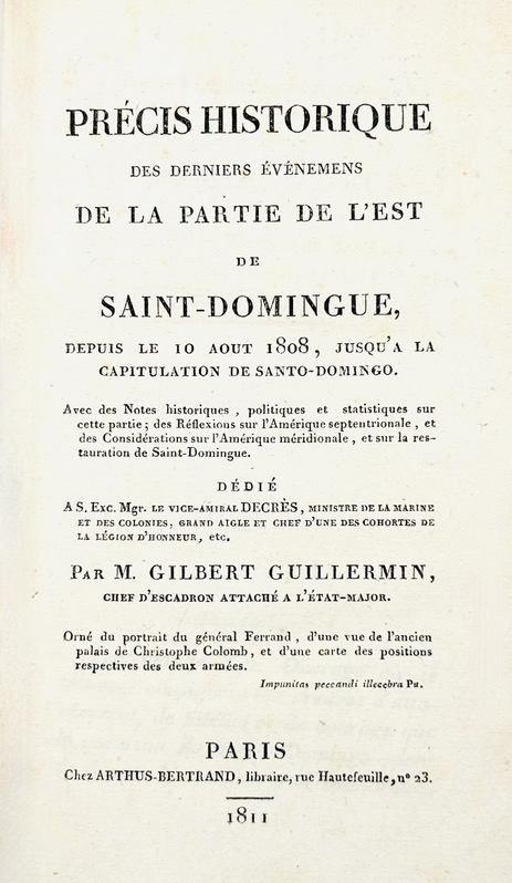 Précis historique des derniers événements de la partie de l'Est de Saint-Domingue depuis le 10 août 1808 jusqu'à la capitulation de Santo-Domingo. Avec des notes historiques, politiques et statistiques sur cette partie ; des réflexions sur l'Amérique septentrionale et des considérations sur l'Amérique méridionale et sur la restauration de Saint-Domingue. par M. Gilbert Guillermin.
